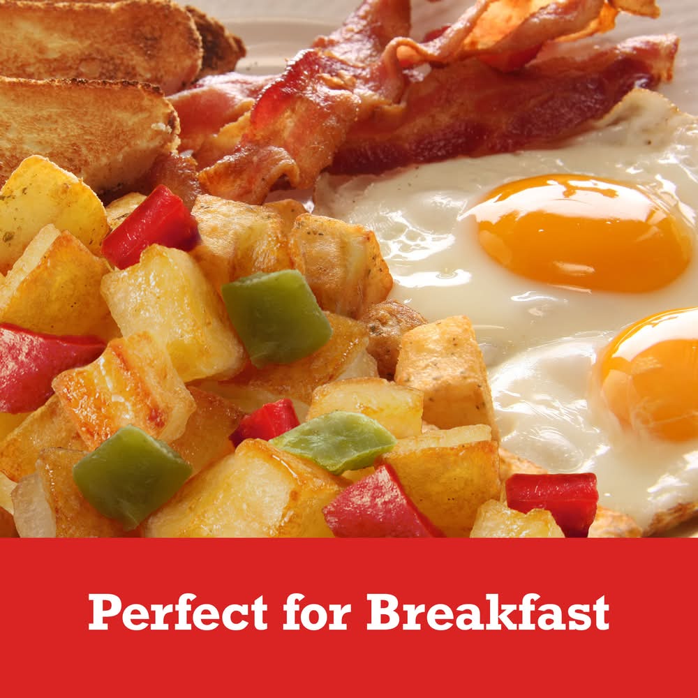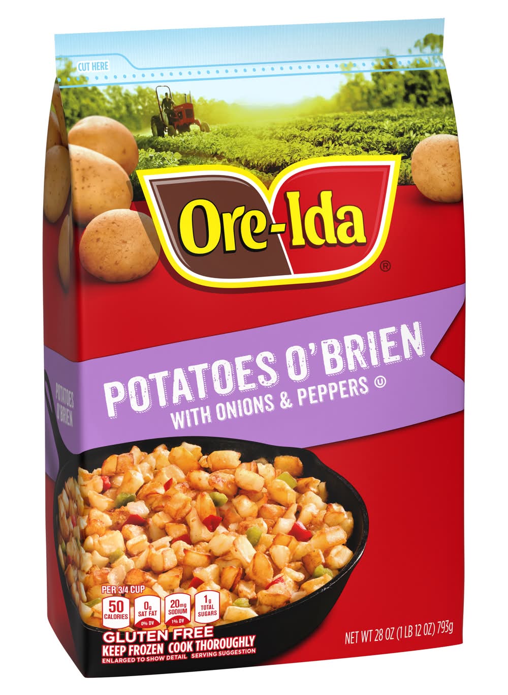 Saves you time on prep with a delicious frozen dish that's ready to cook. Crispy and golden, these frozen potatoes O'Brien are made from freshly peeled, American grown potatoes with bell peppers and onions added for a balance of flavors. These gluten free skillet potatoes contain 0 grams of trans fat per serving. Simply cook them in a skillet with a little oil according to the package directions to get a perfectly crispy easy side dish for your next family meal. The chunks of real potatoes make the perfect addition to your breakfast along with eggs and bacon. They come sealed in a 28 ounce bag for easy storage in your freezer. Your family deserves the highest quality.