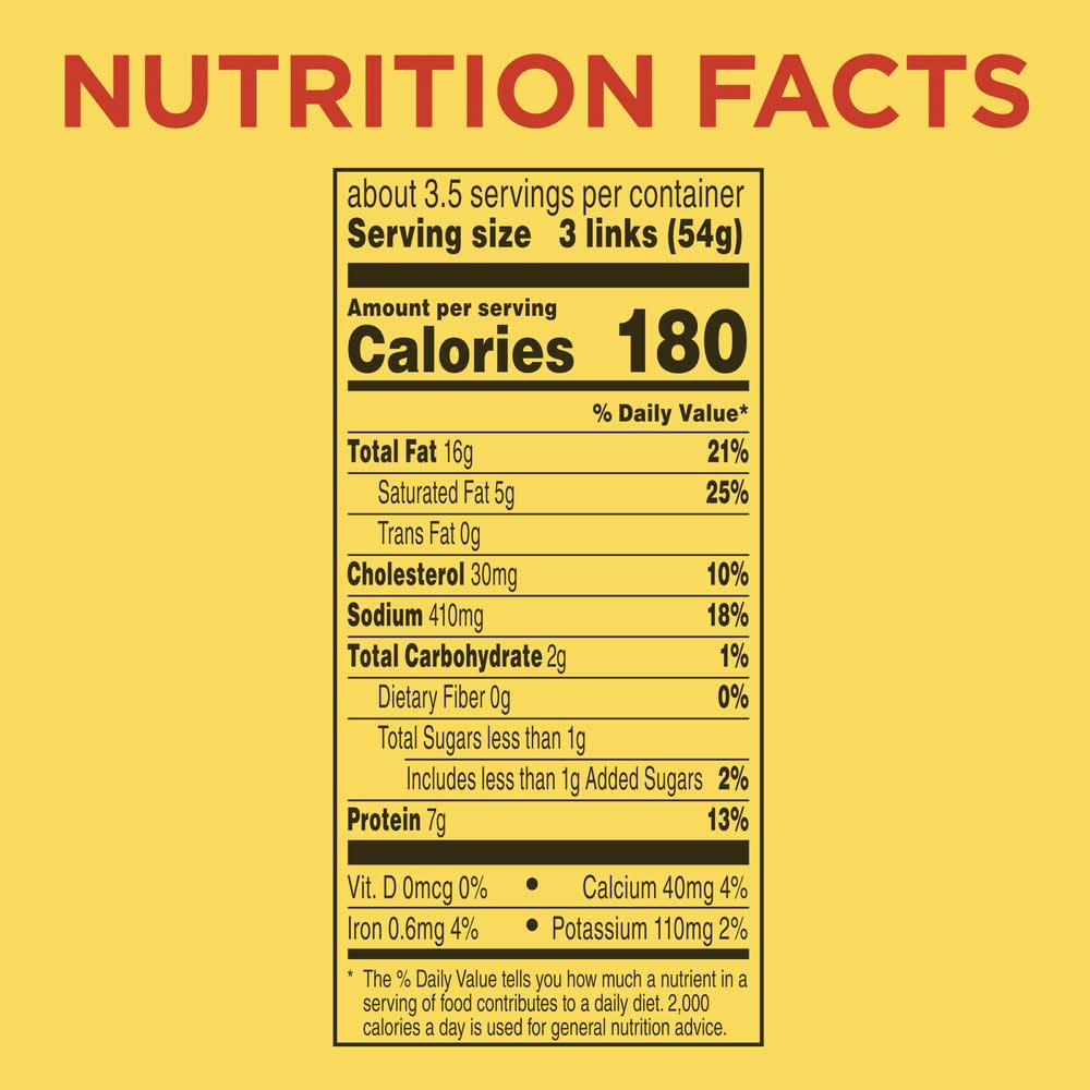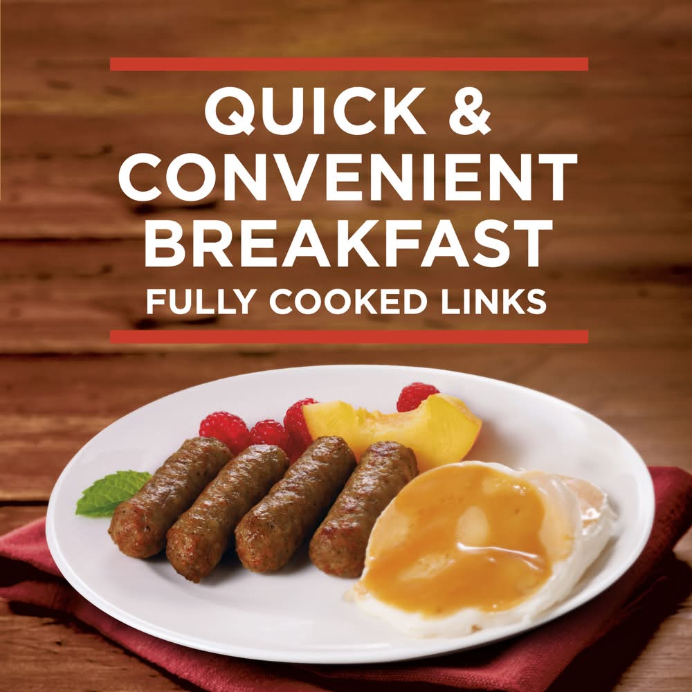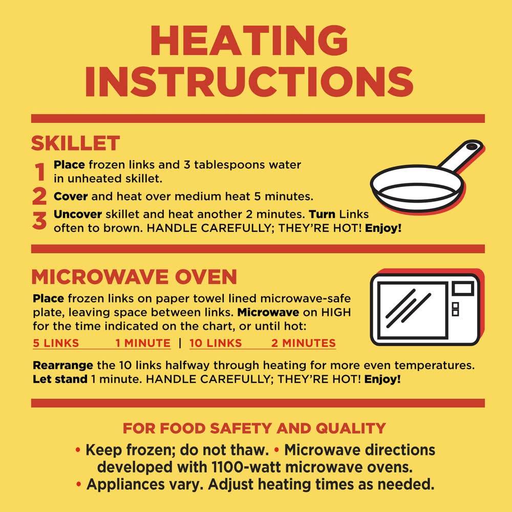 Directions for use: For food safety and quality. Keep frozen; do not thaw. Microwave directions developed with 1100-watt microwave ovens. Appliances vary. Adjust heating times as needed. Skillet: (1) Place frozen links and 3 tablespoons water in unheated skillet. (2) Cover and heat over medium heat 5 minutes, (3) Uncover skillet and heat another 2 to 3 minutes. Turn links often to brown. Handle Carefully; They’re hot! Serve and enjoy! Microwave Oven: For Best Results, Skillet is Recommended. Place frozen links on paper towel lined microwave-safe plate, leaving space between links. Microwave On High For The Time Indicated on Chart, or Until Hot: 5 Links-1 Minute; 10 Links-2 Minutes. Rearrange the 10 links halfway through heating for more even temperature. Let stand 1 minute. Handle Carefully; They’re hot! Enjoy. Keep frozen, microwavable. Do not thaw. After opening, keep frozen. Push here and tear to open. Storage recommendation: Keep frozen, microwavable. Do not thaw. After opening, keep frozen.