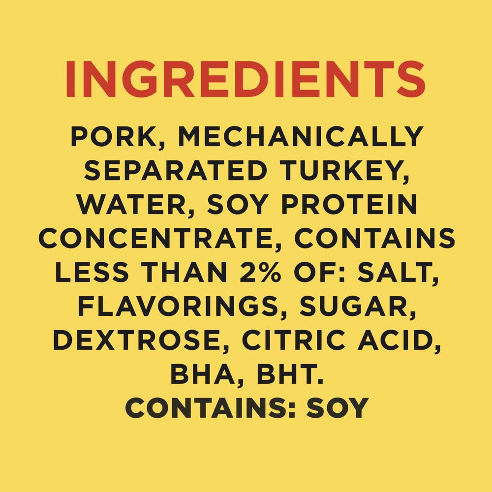 Ingredients: PORK, MECHANICALLY SEPARATED TURKEY, WATER, SOY PROTEIN CONCENTRATE, CONTAINS LESS THAN 2% OF: SALT, FLAVORINGS, SUGAR, DEXTROSE, CITRIC ACID, BHA, BHT. CONTAINS: SOY Contains: Soy