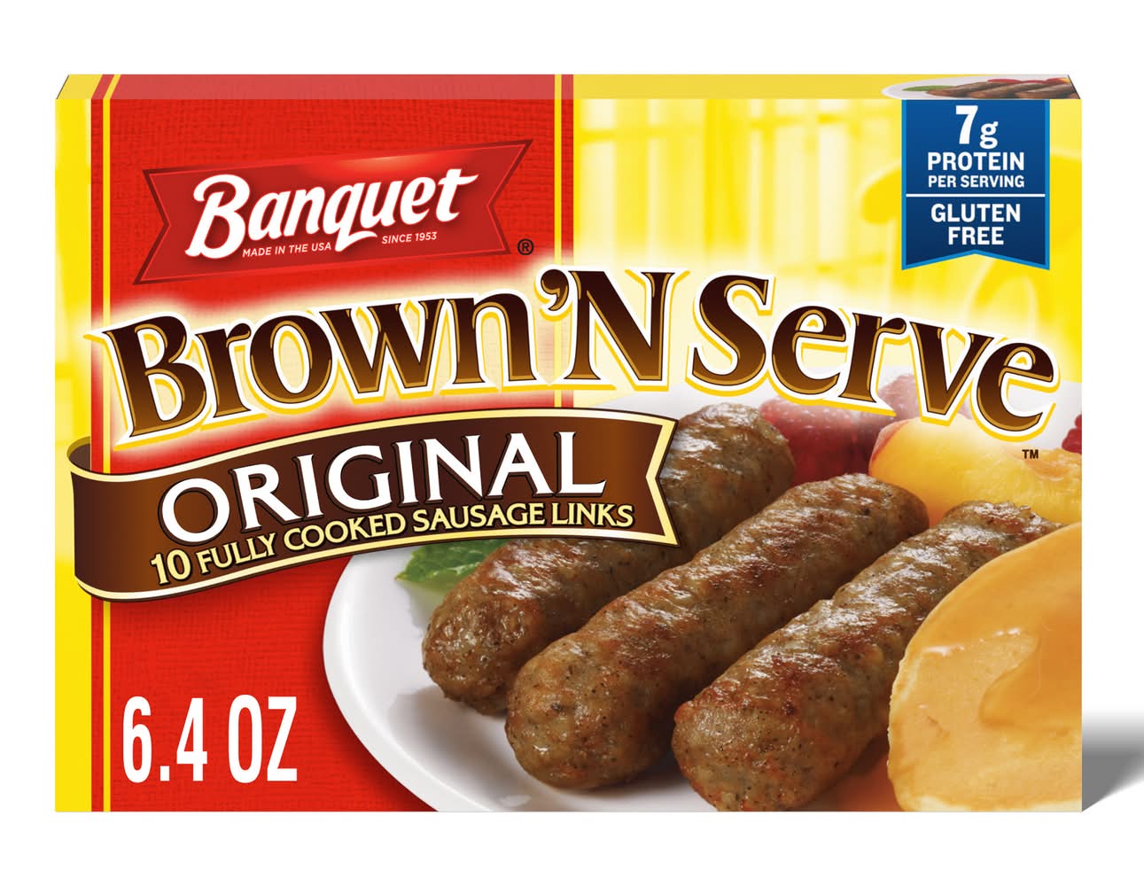 Banquet Brown 'N Serve Original Fully Cooked Sausage Links Frozen Meat offers an easy way to treat yourself and family to a hearty frozen breakfast side. These precooked breakfast sausage links are made with pork, turkey and a special blend of spices and seasonings. Banquet Brown 'N Serve Original Sausage is gluten free and has 6 grams of protein per serving. Enjoy ground pork and turkey sausage links as part of a hot and hearty breakfast that will please the whole family. With the commotion of getting ready for work and school, these breakfast sausages take away the headache of what to eat for breakfast on a hectic morning. Prepare the frozen sausages in a skillet for that fresh, out of the pan taste, or in a microwave for quicker cook time. Keep the 10 pack in the freezer until ready to prepare. For over 60 years, Banquet has been making delicious food the whole family loves. Conagra, PO Box 3534, Chicago, IL, 60654