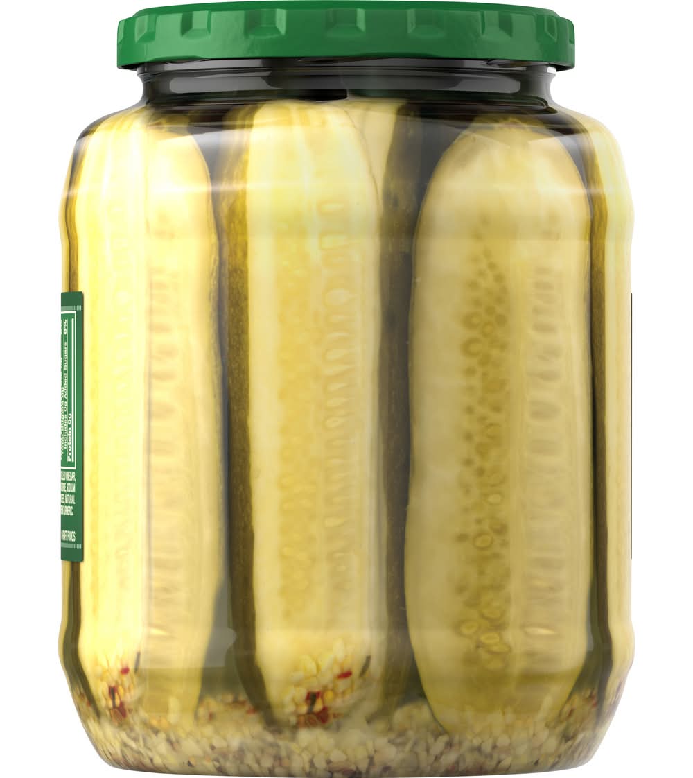 Ingredients: FRESH CUCUMBERS, WATER, SALT, DISTILLED VINEGAR, CONTAINS LESS THAN 2% OF DRIED GARLIC, CALCIUM CHLORIDE, SODIUM BENZOATE (TO PRESERVE FLAVOR), SPICE, MUSTARD SEED, NATURAL FLAVOR, DRIED RED PEPPERS, POLYSORBATE 80, OLEORESIN TURMERIC.