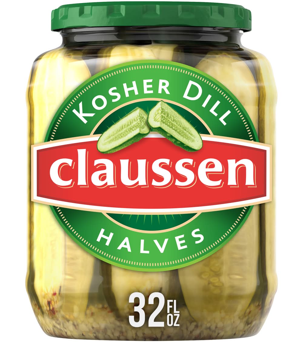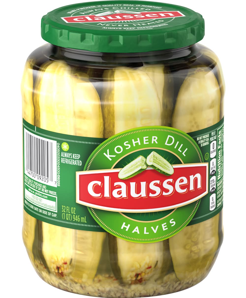 With a sweet and juicy kick, Claussen Kosher Dill Pickle Halves are full of flavor and crunch. Our Claussen pickle halves are crafted with fresh cucumbers picked straight from the vine and refrigerated for our classic Claussen crunch. Pickled with a unique spice blend of turmeric, garlic and red pepper, our dill pickle halves are great served on the side with your burgers, hot dogs and sandwiches. Claussen pickles are vegan, Kosher Certified and a fat free food, making them a delicious snack. Keep our 32-ounce resealable jar of pickle halves refrigerated. Whether you enjoy pickle chips or spears, slices or wholes, you can't beat Claussen's mouthwatering crunch. Kraft Heinz Foods Company, Chicago, IL, 60601