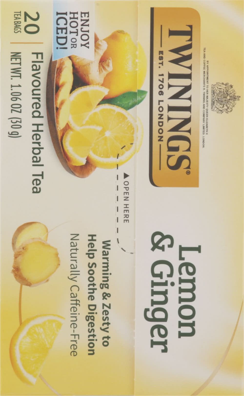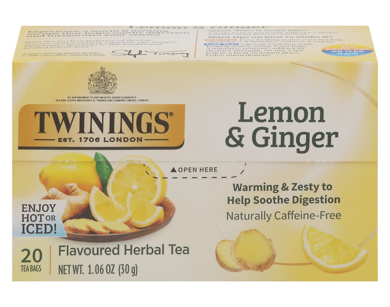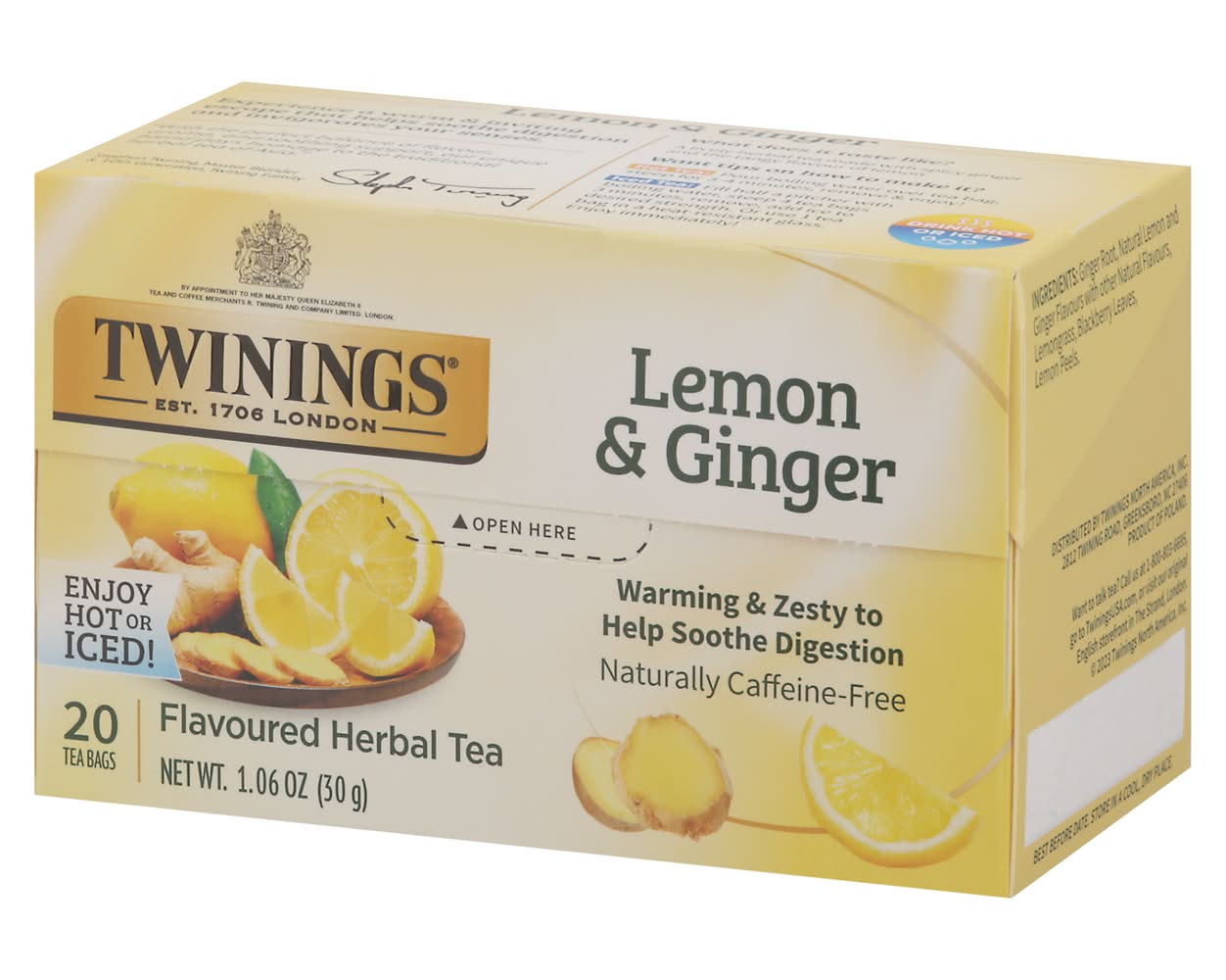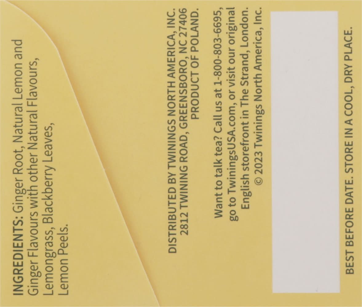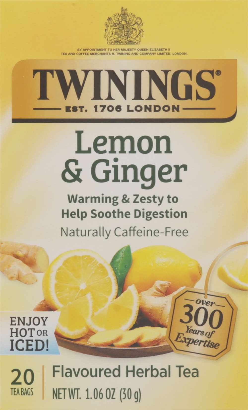 A comforting it made with spicy ginger and the tangy flavor of lemon. Naturally caffeine free. By appointment to her Majesty Queen Elizabeth II. Tea and coffee merchants. A comforting herbal tea expertly blended with ginger and the tangy flavor of lemon to deliver a soothing tea with a warm, inviting aroma and spiced lemon taste. Herbal teas fresh, flavorful & aromatic. For over 300 years, Twining's has been sourcing and blending the finest, high-quality teas from around the globe to ensure that your tea has the perfect balance of tea taste, Flavor and aroma. Twining's blends to perfection the finest herbs, fruits and spices to give you a line of great-tasting herbal teas with mouth-watering flavor , fresh tastes and irresistible aromas. Whatever your mood - there's a blend for every occasion. we recommend that you try other Twining's herbal teas including Pure peppermint and Orange & Cinnamon Spice. Enjoy all of Twining's Premium Teas. Classic: Traditional style black teas. Premium Blacks Fine black teas with just the right amount of flavor . Chai: Black teas blended with Savory spice Flavors. Origins: From the world's best tea regions. Greens Naturally refreshing teas with a smooth taste. Herbals: Caffeine free herbal & fruit flavor blends. Cold Brewed Refreshing iced teas that brew in cold water in just 5 minutes. Individual tea bags sealed for freshness. Sourced with care. • Flavor: Lemon & ginger • Twinings North America Inc., 777 Passaic Avenue,NJ,Clifton,07012