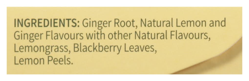Ingredients: Ginger Root, Natural Lemon and Ginger Flavours with Other Natural Flavours, Lemongrass, Blackberry Leaves, Lemon Peels