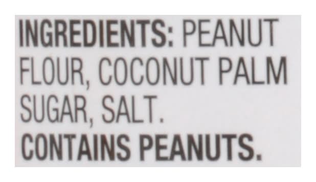 Ingredients: Peanut Flour, Coconut Palm Sugar, Salt Contains: Peanuts, Tree Nuts, Coconuts