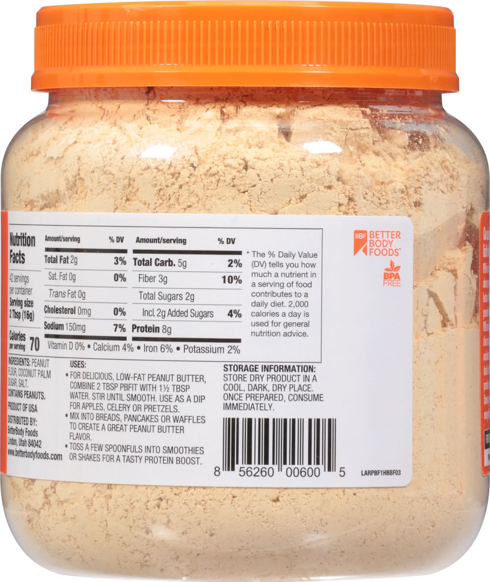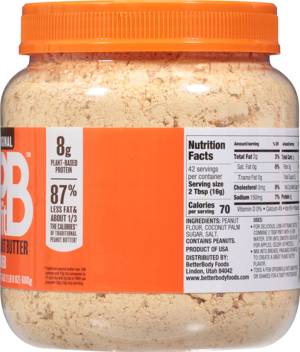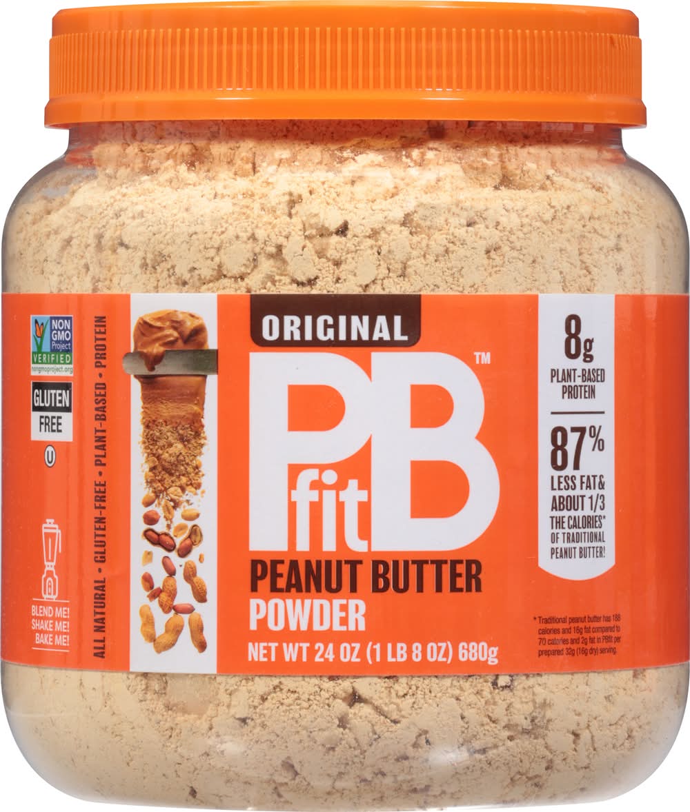 8 g plant-based protein. Gluten free. Of traditional peanut butter non gmo project verified. All natural. Go ahead lick the spoon pbfit is everything you love about peanut butter, made better. Whole-roasted peanuts, pressed to perfection, means pbfit contains 87% less fat than traditional peanut butter, and about 1/3 the calories all that's left is powerful peanut protein, and a rich, guilt-free flavor you'll crave on everything. Blend me shake me bake me Packaging: Reusable