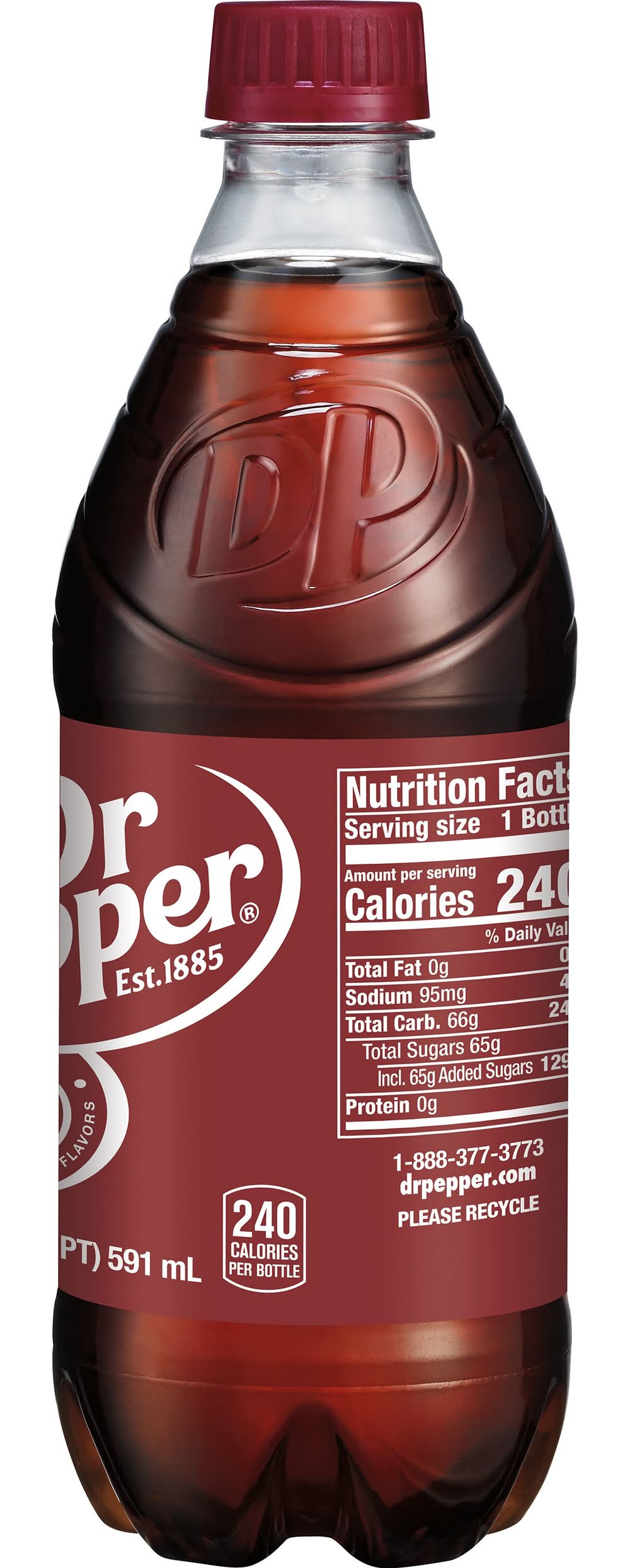 Our original soda offers a distinct blend of 23 flavors in a bottle. each bottle contains 250 calories and a caffeine content of 68 milligrams. • Dr Pepper/Seven Up, Inc., 6425 Hall of Fame Lane,Frisco,TX,75034 • Packaging: Reusable