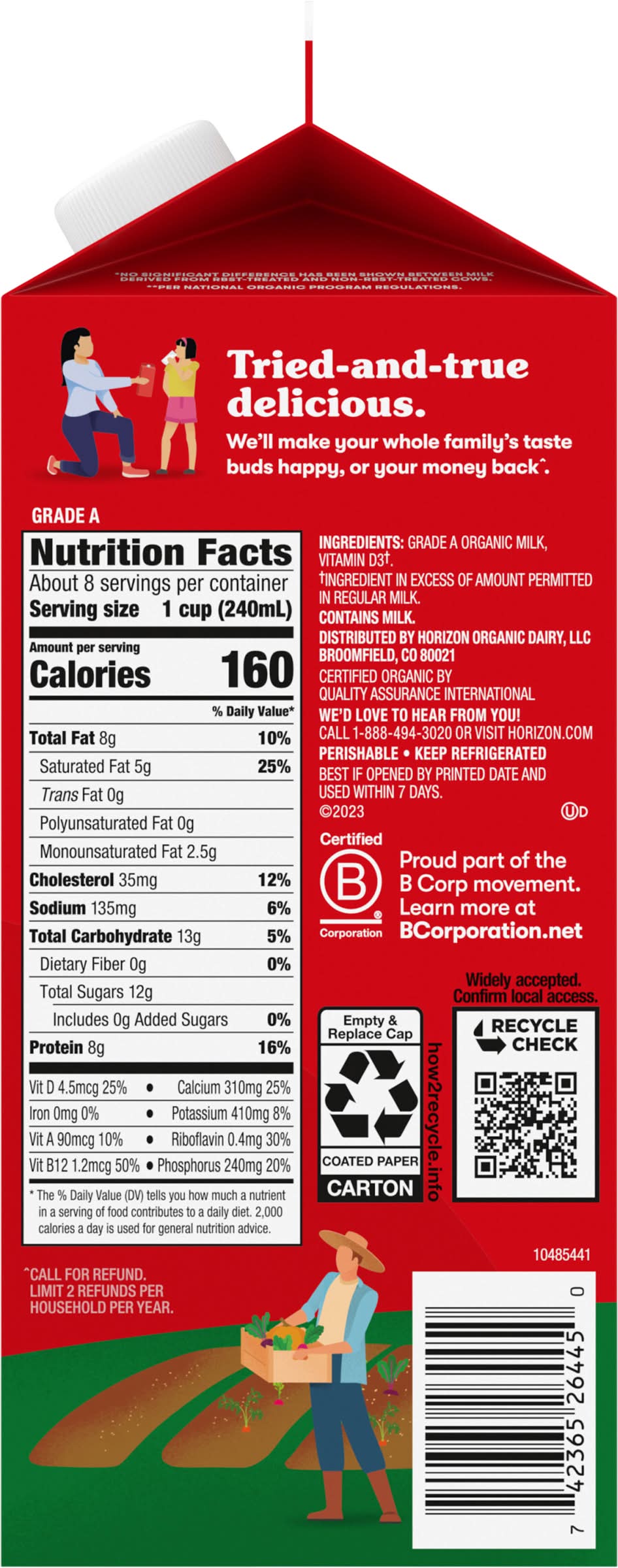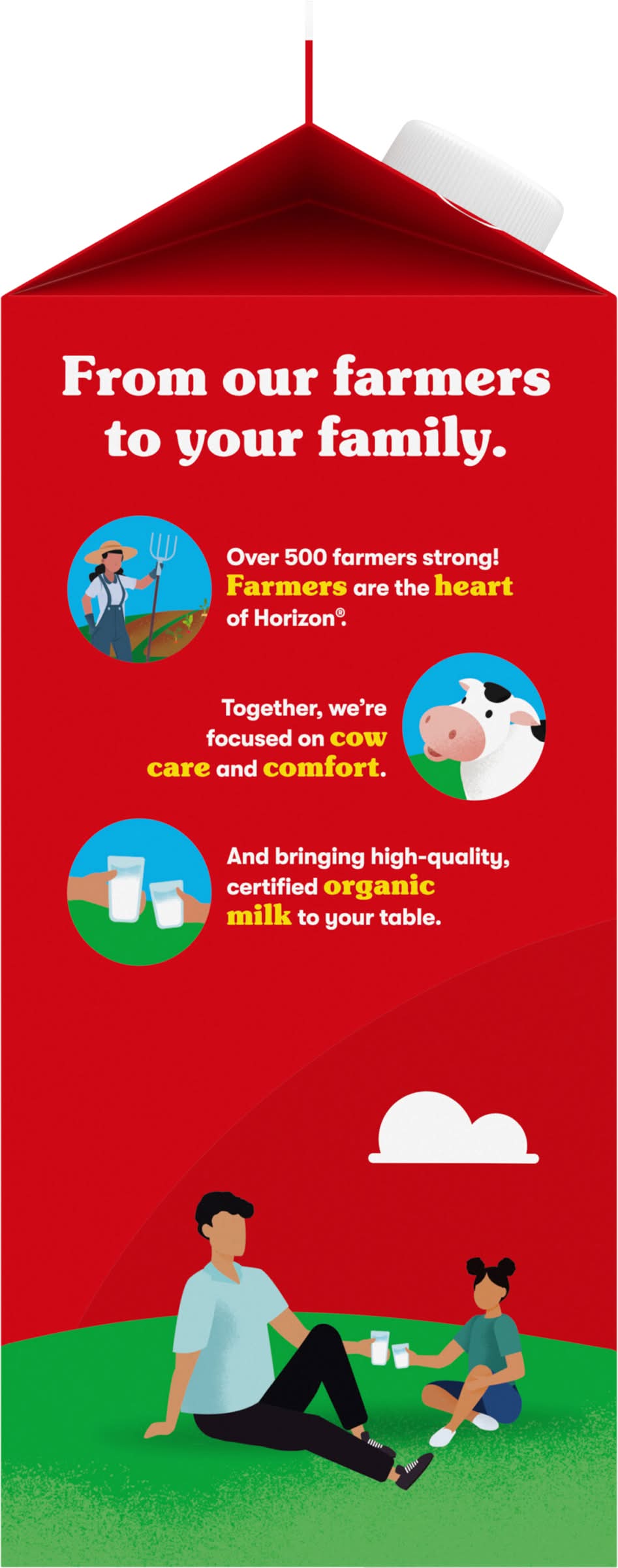Certified Organic by Quality Assurance International. Vitamin D. See nutrition facts for sat. fat content. High Vitamin D: Supports strong bone health. Made with non-GMO ingredients. Horizon organic farming means. No prohibited pesticides used. No growth hormones used. No antibiotics used. Pasture-raised cows. Tried-and-true delicious. Two generations of families- and counting-have grown up on horizon organic milk. We love cows. Our cows get plenty of sunshine and fresh air. They eat an all-organic, non-gmo diet and are not given added hormones or antibiotics. Stewarding the land. We offer regenerative agriculture education to help our farmers create nutrient-rich soil. A happy healthy future. Caring for your family every day-and our farming family too-is how we nourish a bright tomorrow for generations to come. From our farmers to your family. Over 500 farmers strong Farmers are the heart of Horizon Together, we're focused on cow care and comfort. And bringing high-quality, certified organic milk to your table. We'll make your whole family's taste buds happy. • Horizon Organic, Guaynabo, PR, • Packaging: Reusable