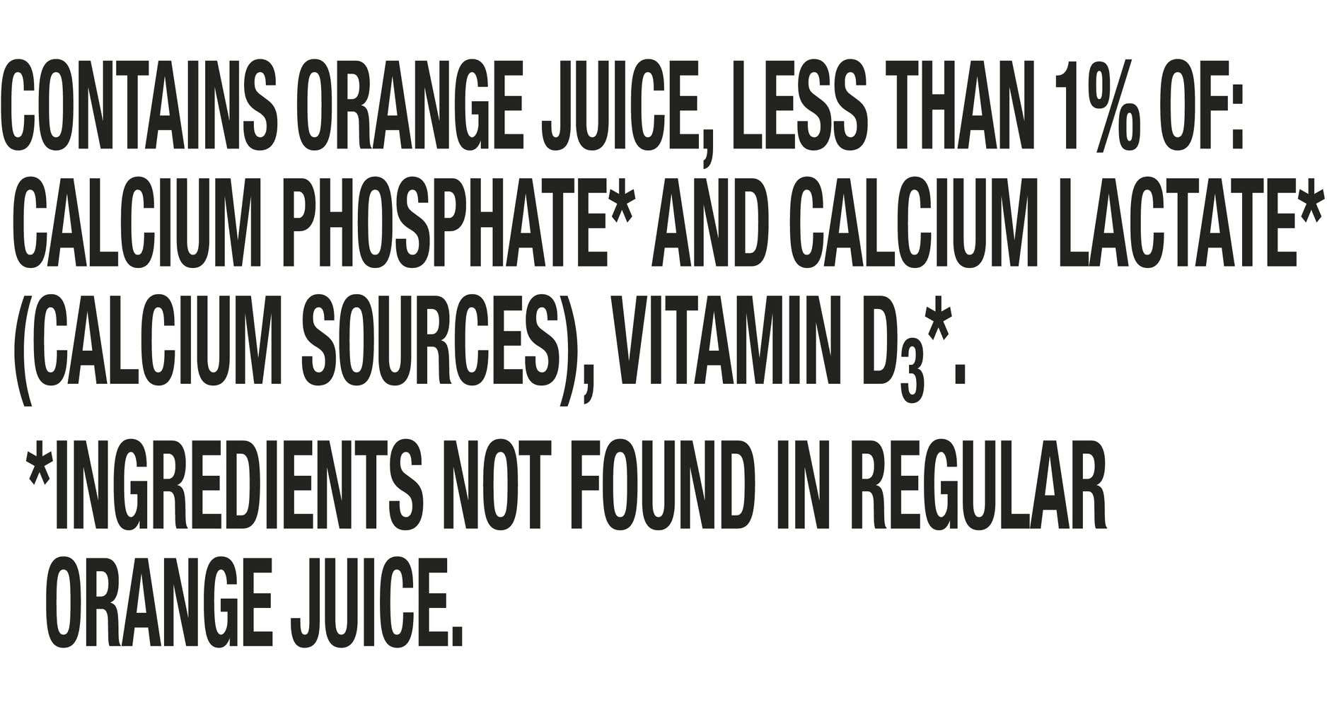 Ingredients: Contains Orange Juice, Less Than 1% Of: Calcium Phosphate And Calcium Lactate (Calcium Sources), Vitamin D3. Ingredients Not Found In Regular Orange Juice.