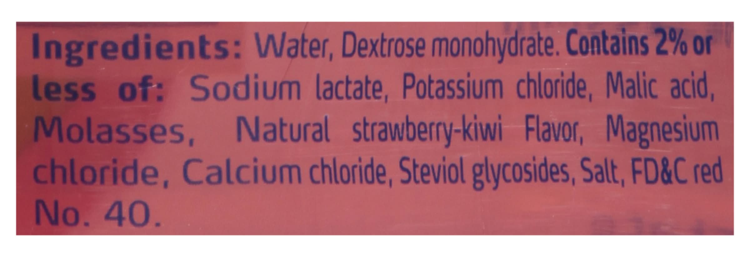 Ingredients: Water, Dextrose Monohydrate, Contains 2% or Less of Sodium Lactate, Potassium Chloride, Malic Acid, Molasses, Natural Strawberry-Kiwi Flavor, Magnesium Chloride, Calcium Chloride, Steviol Glycosides, Salt, FD&C Red 40