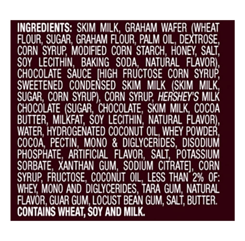 Ingredients: Skim Milk, Graham Wafer (Wheat Flour, Sugar, Graham Flour, Palm Oil, Dextrose, Corn Syrup, Modified Corn Starch, Honey, Salt, Soy Lecithin, Baking Soda, Natural Flavor), Chocolate Sauce [High Fructose Corn Syrup, Sweetened Condensed Skim Milk (Skim Milk, Sugar, Corn Syrup), Corn Syrup, Hershey's Milk Chocolate (Sugar, Chocolate, Skim Milk, Cocoa Butter, Milkfat, Soy Lecithin, Natural Flavor), Water, Hydrogenated Coconut Oil, Whey Powder, Cocoa, Pectin, Mono & Diglycerides, Disodium Phosphate, Artificial Flavor, Salt, Potassium Sorbate, Xanthan Gum, Sodium Citrate], Corn Syrup, Fructose, Coconut Oil, Less than 2% of: Whey, Mono and Diglycerides, Tara Gum, Natural Flavor, Guar Gum, Locust Bean Gum, Salt, Butter Contains: Wheat, Soybeans, Milk, Corn, Tree Nuts, Coconuts