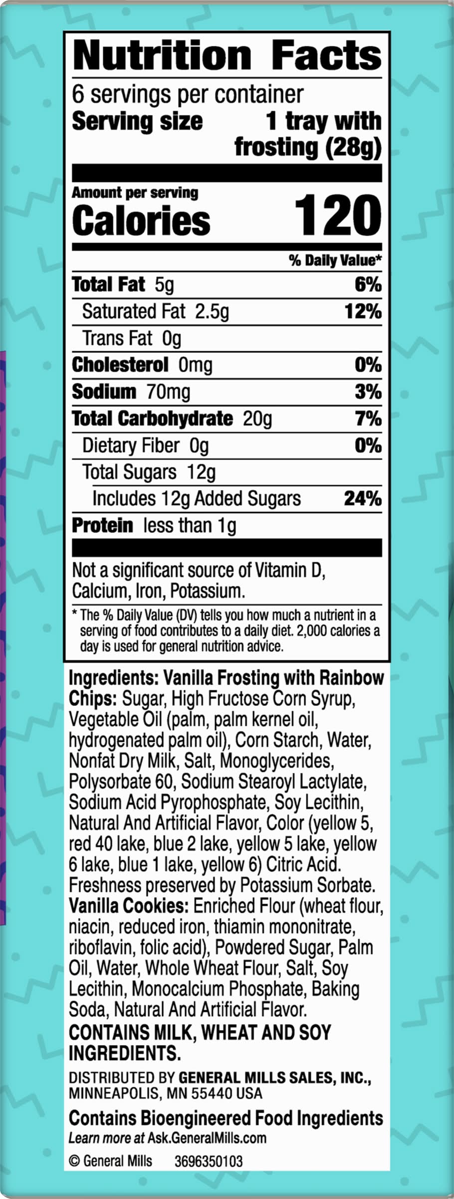 Ingredients: Vanilla Frosting with Rainbow Chips: Sugar, High Fructose Corn Syrup, Vegetable Oil (Palm, Palm Kernel Oil, Hydrogenated Palm Oil), Corn Starch, Water, Nonfat Dry Milk, Salt, Monoglycerides, Polysorbate 60, Sodium Stearoyl Lactylate, Sodium Acid Pyrophosphate, Soy Lecithin, Natural and Artificial Flavor, Color (Yellow 5, Red 40 Lake, Blue 2 Lake, Yellow 5 Lake, Yellow 6 Lake, Blue 1 Lake, Yellow 6) Citric Acid, Freshness Preserved by Potassium Sorbate, Vanilla Cookies: Enriched Flour (Wheat Flour, Niacin, Reduced Iron, Thiamin Mononitrate, Riboflavin, Folic Acid), Powdered Sugar, Palm Oil, Water, Whole Wheat Flour, Salt, Soy Lecithin, Monocalcium Phosphate, Baking Soda, Natural and Artificial Flavor Contains: Milk, Wheat, Soybeans, Corn
