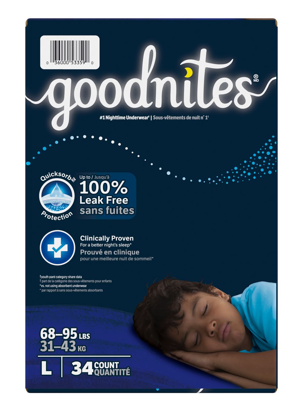 Fits Sizes: 31-43 kg. Quicksorb protection up to 100% leak free no matter how your child sleeps. Clinically proven for a better night's sleep (vs. not using absorbent underwear). 40% more protection vs. leading training pant. Underwear-like fit. Odor absorbing. Quicksorb 5 layer protection. Zonde protection for boys. Double leg barriers. Free of harsh ingredients. • Size: L • Kimberly-clark Global Sales, LLC, P.O Box 2020, Neenah, WI, 54957-2020 • Packaging: Reusable