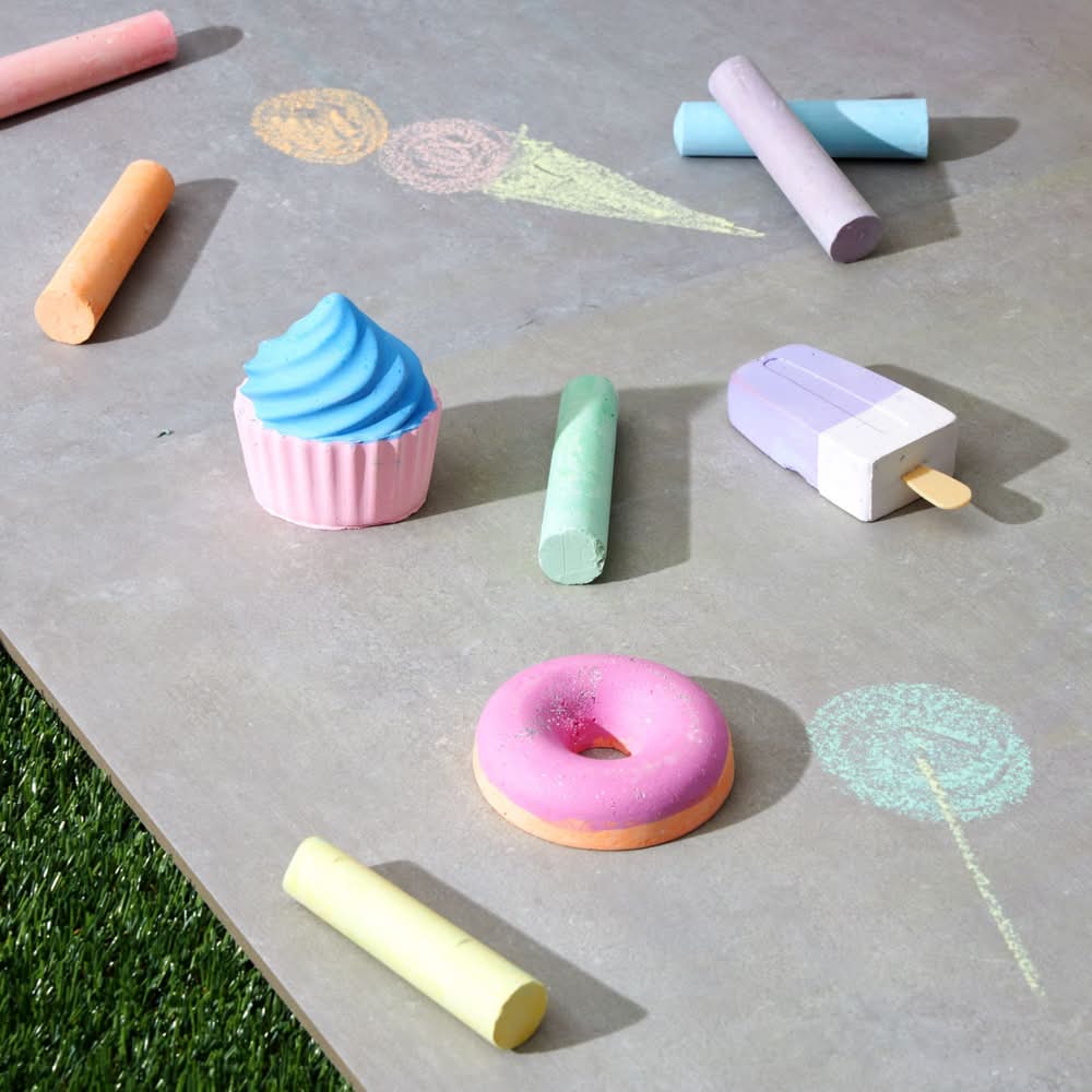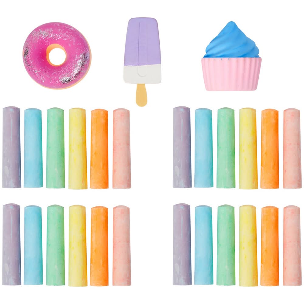 Ignite your creativity with the 27-piece Chalk Sweets sidewalk chalk set. Featuring three jumbo sweet treat character chalks and 24 vibrant sidewalk chalk sticks in six brilliant colors, this set is perfect for outdoor fun and imaginative play. 27 pieces Non-toxic For ages 4+