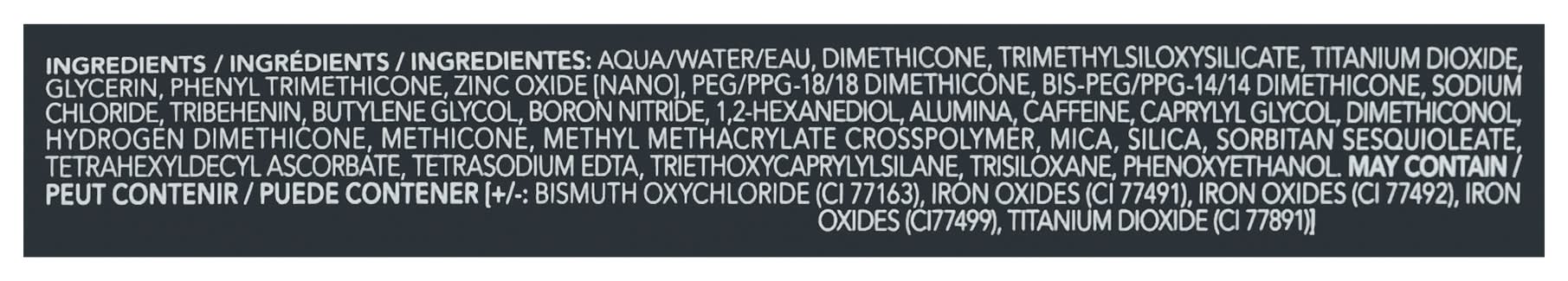Ingredients: Aqua/Water/Eau, Dimethicone, Trimethylsiloxysilicate, Titanium Dioxide, Glycerin, Phenyl Trimethicone, Zinc Oxide (Nano), PEG/PPG-18/18 Dimethicone, Bis-PEG/PPG-14/14 Dimethicone, Sodium Chloride, Tribehenin, Butylene Glycol, Boron Nitride, 1.2-Hexanediol, Alumina, Caffeine, Caprylyl Glycol, Dimethiconol, Hydrogén Dimethicone, Methicone, Methyl Methacrylate Crosspolymer, Mica, Silica, Sorbitan Sesquioleate, Tetrahexyldecyl Ascorbate, Tetrasodium EDTA, Triethoxycaprylylsilane, Trisiloxane, Phenoxyethanol. May Contain/Peut Contenir/Puede Contener [+/-: Bismuth Oxychloride (CI 77163), Iron Oxides (CI 77491), Iron Oxides (CI 77492), Iron Oxides (C177499), Titanium Dioxide (CI 77891)]