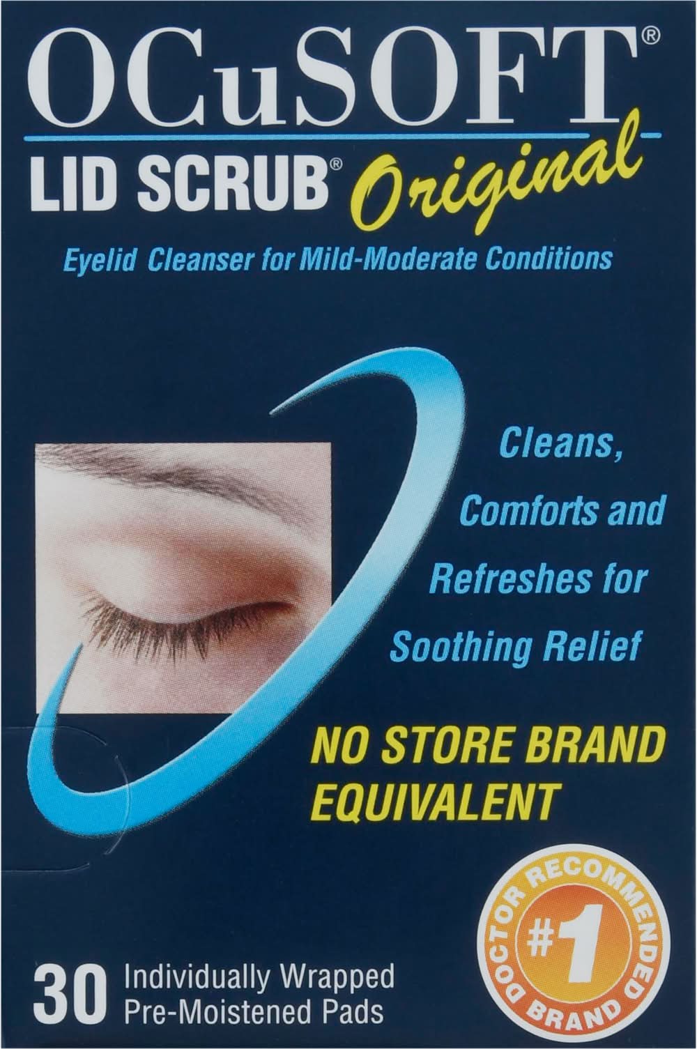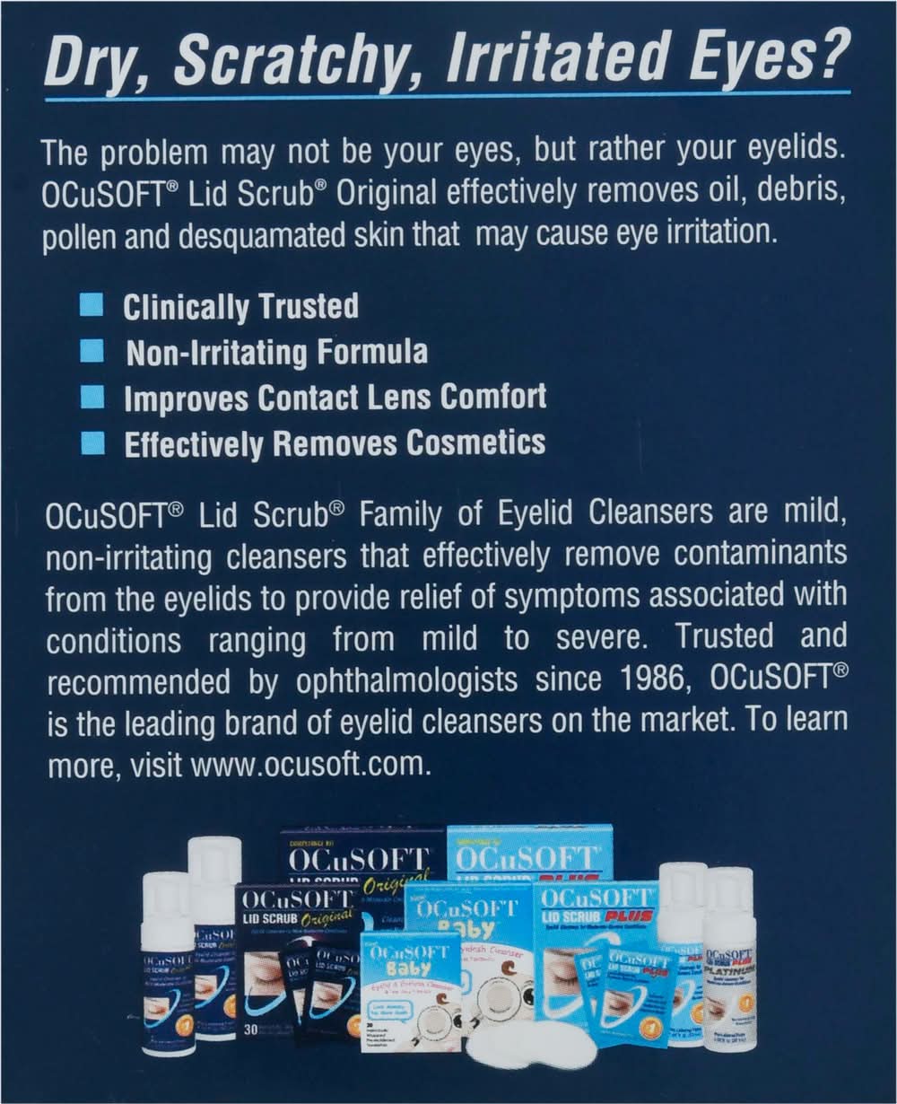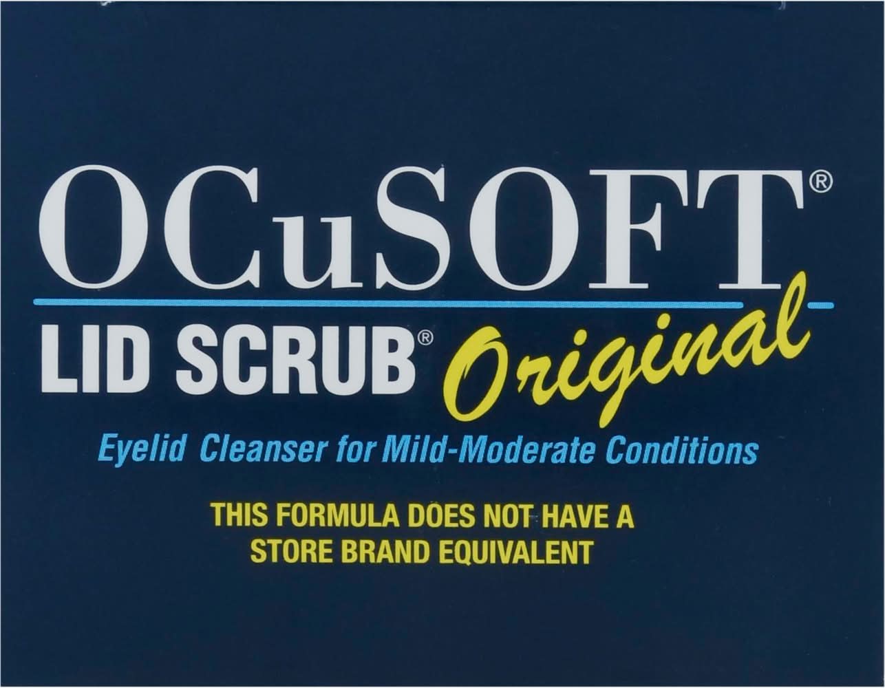 Eyelid cleanser for mild-moderate conditions. Cleans, comforts and refreshes for soothing relief. Individually wrapped pre-moistened pads. No.1 doctor recommended brand. This formula does not have a store brand equivalent. Dry, Scratchy, Irritated Eyes? The problem may not be your eyes, but rather your eyelids. Lid Scrub Original effectively removes oil, debris and desquamated skin that may cause eye irritation. Clinically trusted. Non-irritating formula. Improves contact lens comfort. Effectively removes cosmetics. Lid Scrub Family of Eyelid Cleansers are mild, non-irritating cleansers that effectively remove contaminants from the eyelids to provide relief of symptoms associated with conditions ranging from mild to severe. Trusted and recommended by ophthalmologists since 1986, is the leading brand of eyelid cleansers on the market. Ocusoft, Inc., Rosenberg,TX,77471