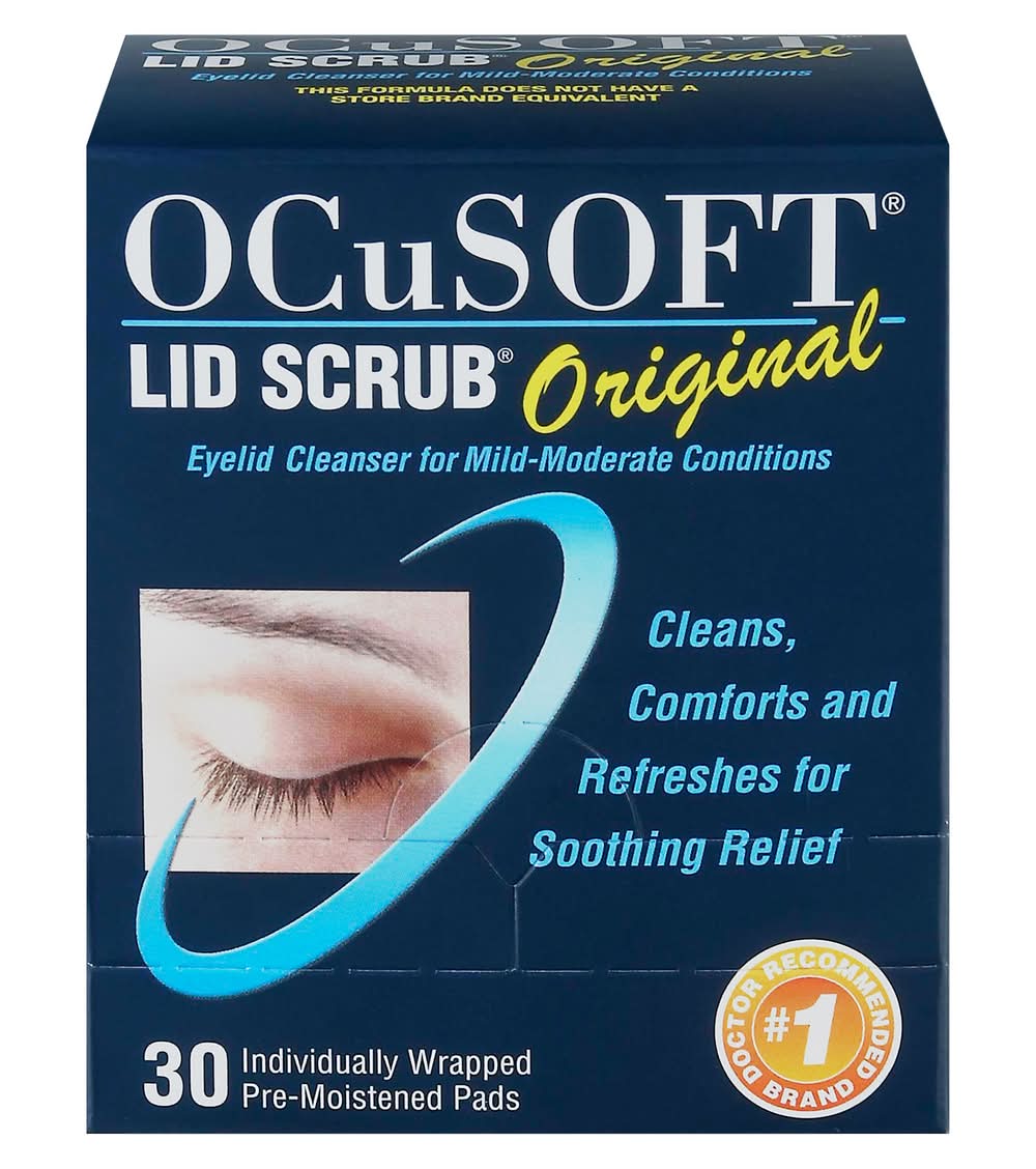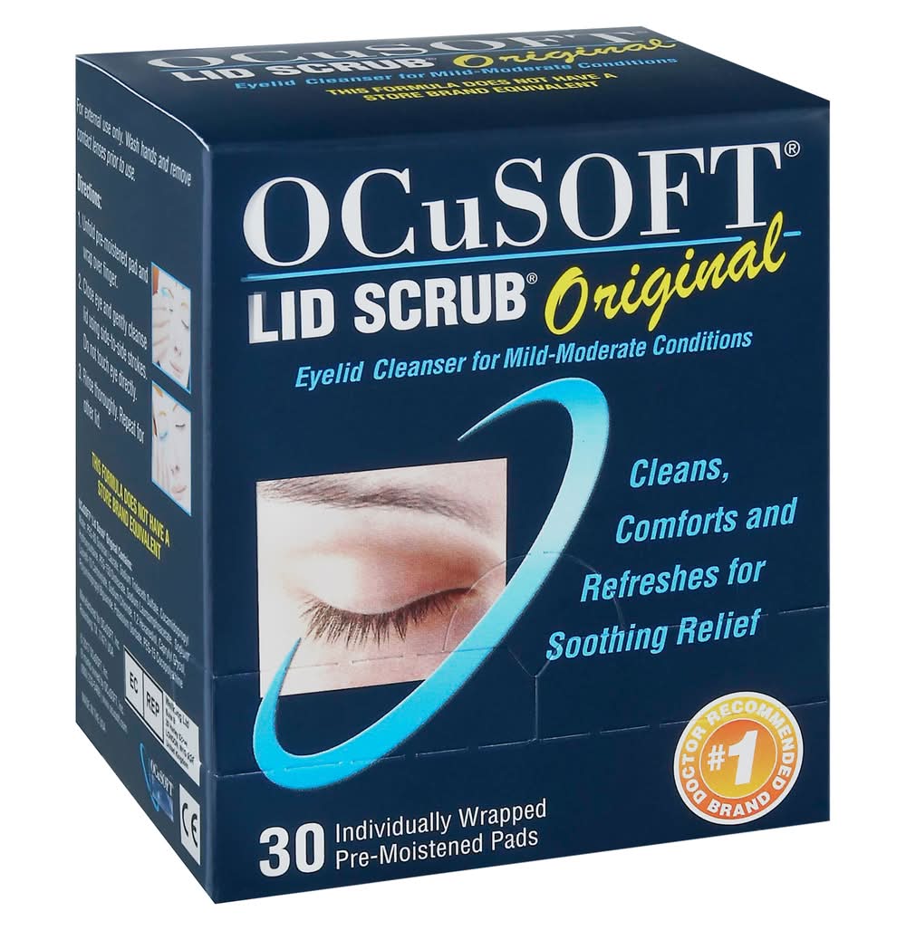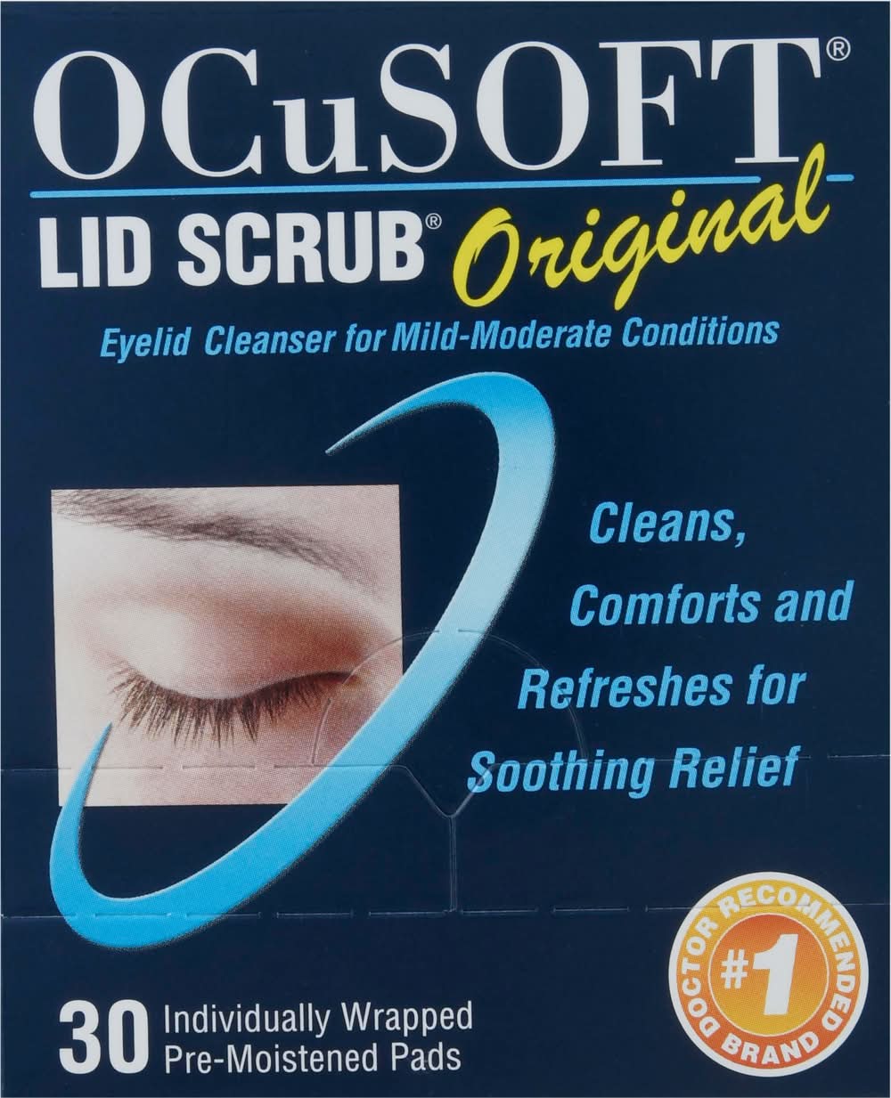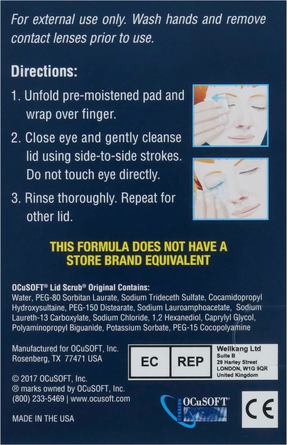 Eyelid cleanser for mild-moderate conditions. Cleans, comforts and refreshes for soothing relief. Individually wrapped pre-moistened pads. No.1 doctor recommended brand. This formula does not have a store brand equivalent. Dry, Scratchy, Irritated Eyes? The problem may not be your eyes, but rather your eyelids. Lid Scrub Original effectively removes oil, debris and desquamated skin that may cause eye irritation. Clinically trusted. Non-irritating formula. Improves contact lens comfort. Effectively removes cosmetics. Lid Scrub Family of Eyelid Cleansers are mild, non-irritating cleansers that effectively remove contaminants from the eyelids to provide relief of symptoms associated with conditions ranging from mild to severe. Trusted and recommended by ophthalmologists since 1986, is the leading brand of eyelid cleansers on the market. Ocusoft, Inc., Rosenberg,TX,77471