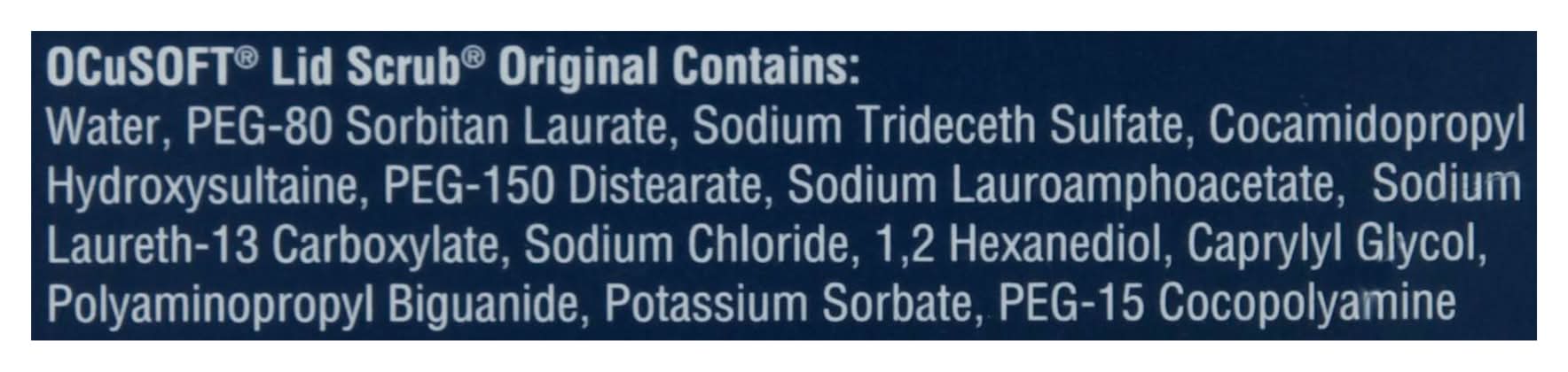 Ingredients: Ocusoft Lid Scrub Original Contains: Water, PEG-80 Sorbitan Laurate, Sodium Trideceth Sulfate, Cocamidopropyl Hydroxysultaine, PEG-150 Distearate, Sodium Lauroamphoacetate, Sodium Laureth-13 Carboxylate, Sodium Chloride, 1.2 Hexanediol, Caprylyl Glycol, Polyaminopropyl Biguanide, Potassium Sorbate, PEG-15 Cocopolyamine