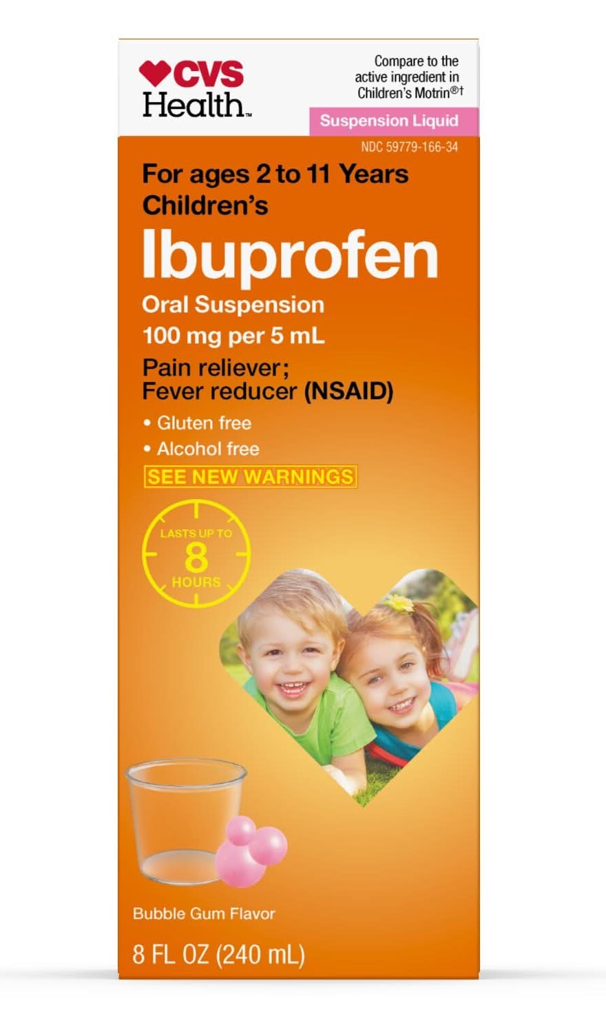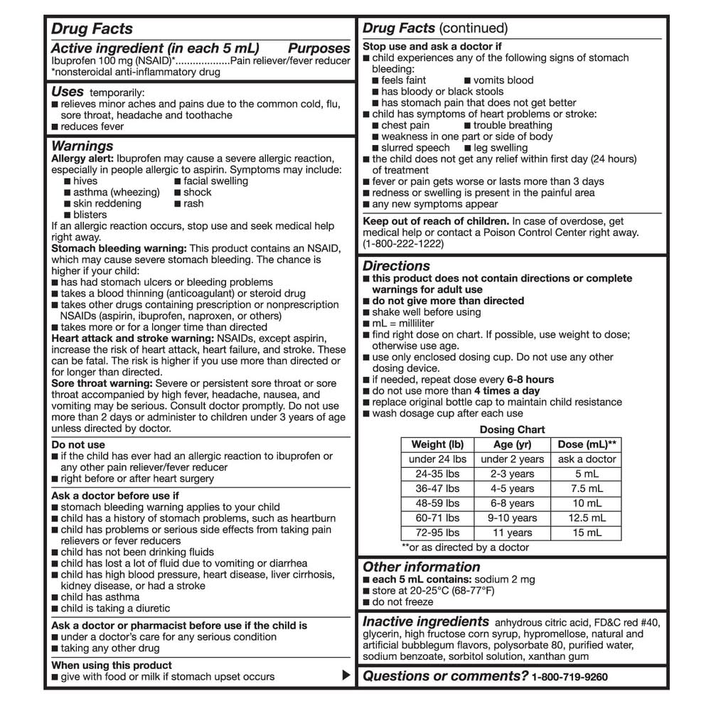 HSA/FSA Eligible To ensure equitable access for all our customers, there is currently a two (2) product limit on all children’s pain relief products at all CVS Pharmacy locations and cvs.com. We’re committed to meeting our customers’ needs and are working with our suppliers to ensure continued access to these items. Compare to Children's Motrin® active ingredient. Children's Ibuprofen Oral Suspension 100 mg per 5 mL, Bubble Gum Flavor, temporarily reduces fever and relieves minor aches and pains due to the common cold, flu, sore throat, headache and toothache, for up to 8 hours. The active ingredient is 100 mg ibuprofen (NSAID)* per 5 mL, a pain reliever/fever reducer for children ages 2 to 11 years. Dosage cup included. *nonsteroidal anti-inflammatory drug THE ACTIVE INGREDIENT in Children's Ibuprofen Oral Suspension is ibuprofen 100 mg per 5 mL, a pain reliever and fever reducer. One dose of this bubble gum flavored liquid medicine provides relief for up to 8 hours for children ages 2 to 11 years. Compare to the active ingredient in Children's Motrin®. WHEN PAIN OR FEVER derails your child, get back on track with Children's Ibuprofen Oral Suspension 100 mg per 5 mL, a nonsteroidal anti-inflammatory drug that reduces fever and minor aches and pains of the common cold, flu, sore throat, headache and toothache for up to 8 hours. MADE FOR CHILDREN: Bubble Gum flavor is a kid-friendly choice for Children's Ibuprofen Oral Suspension, 100 mg per 5 mL, which is a pain reliever/fever reducer specifically formulated for children ages 2 to 11. Plus the container features a child-resistant safety cap. ONE DOSE provides relief of pain and fever for up to 8 hours. Dosage cup included. GLUTEN FREE: This children's pain reliever/fever reducer is gluten free and contains no alcohol.
