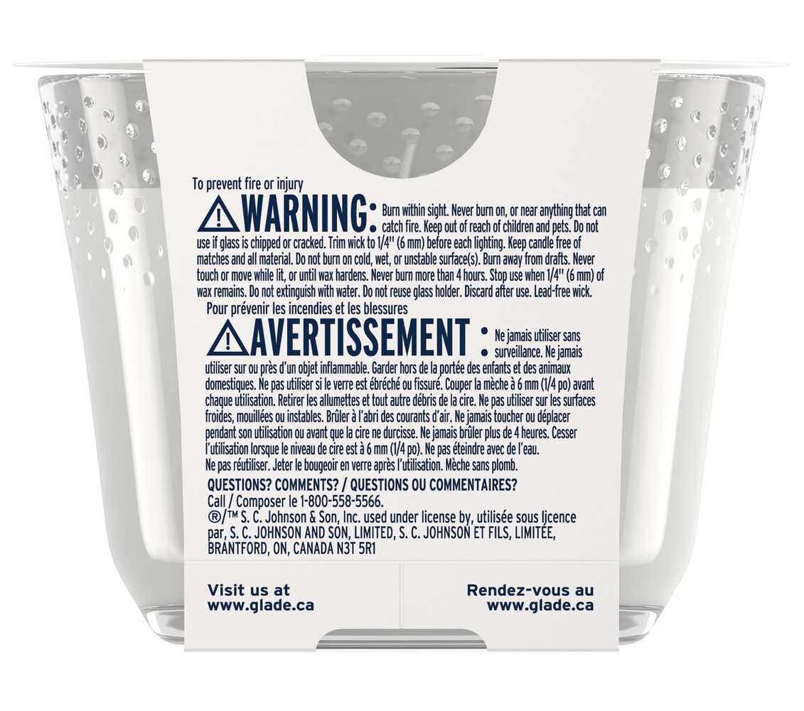 Experience the modern comfort of Glade Sheer Vanilla Embrace with a 3-wick candle that provides an enhanced glow and an enriched fragrance. Delight in the sophisticated blend of sweet florals, creamy vanilla, and white woods, all artfully combined with essential oils. The packaging is made from recyclable paperboard, which includes 30% post-consumer recycled material, and the candle itself is crafted in Canada. • S.C. Johnson & Son, Inc., Racine,WI,53403-2236,USA • Packaging: Reusable
