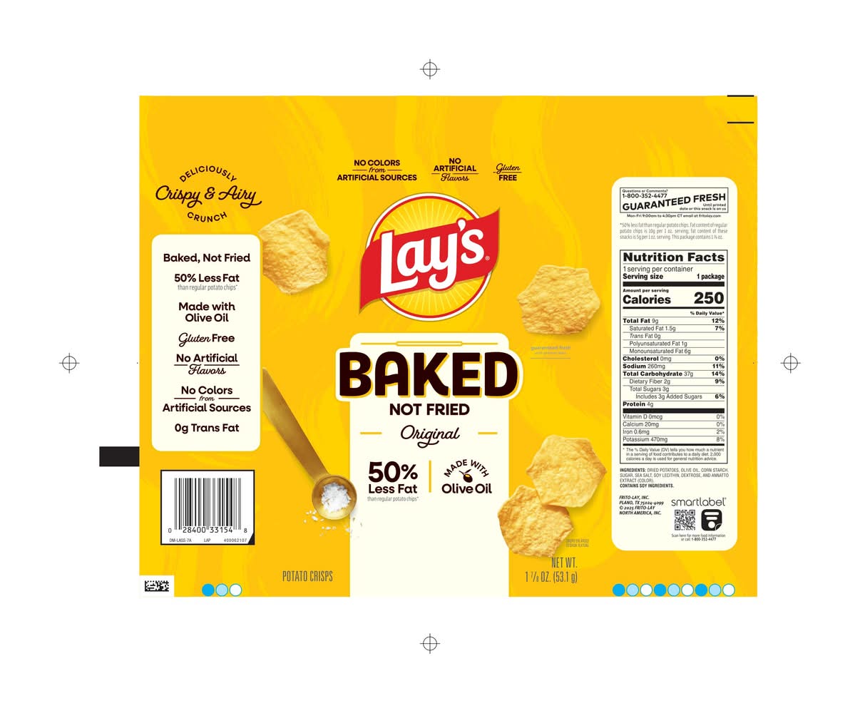 Frito-Lay's line of Oven Baked snacks are baked, not fried, to give you the great taste you've come to love with Frito-Lay snacks. On top of that, Lay's Oven Baked Original Potato Crisps have 65% less fat than regular potato chips. Baked Lay's potato chips with less fat Original flavor Enjoy at home, at work, or on the go • Flavor: Original • Frito-lay, inc., Plano, TX, 75024-4099, 800-352-4477