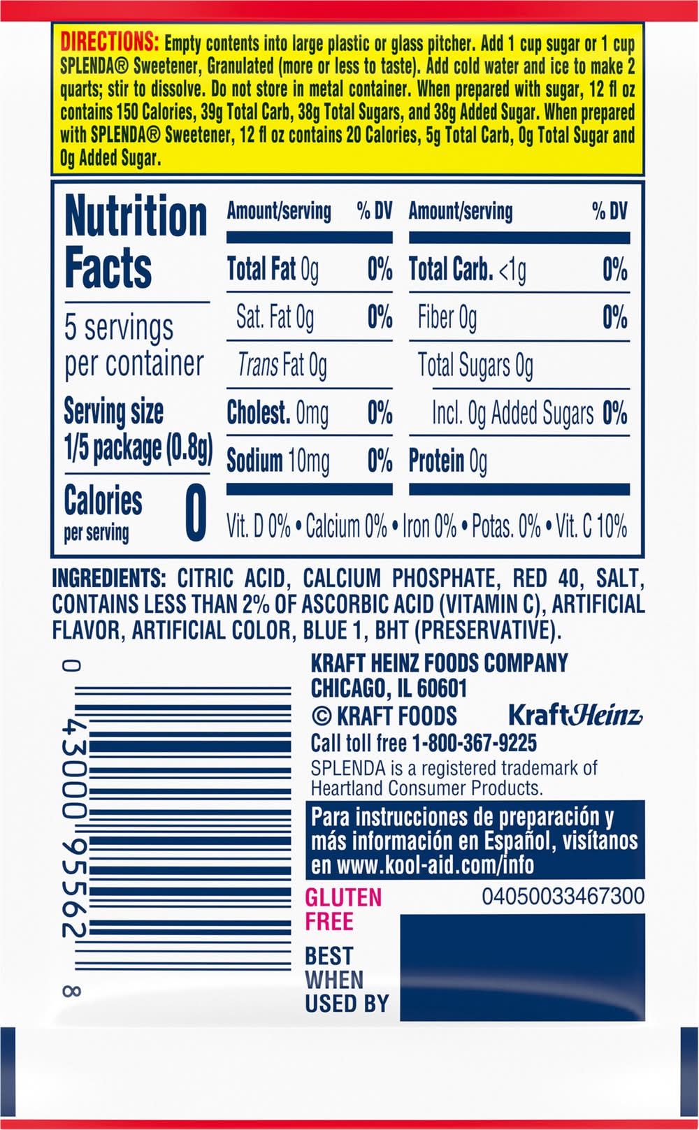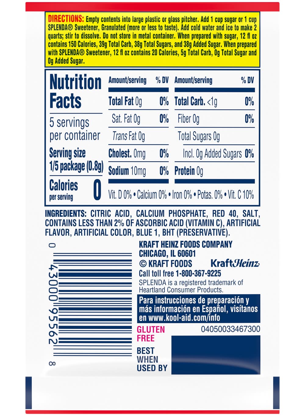 Kool-Aid Artificially Flavored Cherry Unsweetened Powdered Drink Mix is a delicious way to stay hydrated. This unsweetened powdered drink mix makes it easy to prepare a tasty red cherry drink. Just mix it with water and sugar or your sweetener of choice. Quench your thirst with the refreshingly sweet taste of cherry. With no caffeine, this artificially flavored powdered drink mix is always a great choice for the whole family. It's also a good source of vitamin C. These handy packets of unsweetened cherry drink ensure that you always have a refreshing beverage ready-to-go. To prepare, empty contents of the 0.13 ounce drink mix packet into a plastic or glass pitcher. Add 1 cup of sugar or sweetener. Then, just add ice and water and stir for a 2 quart supply of tasty cherry Kool-Aid. Flavor: Cherry