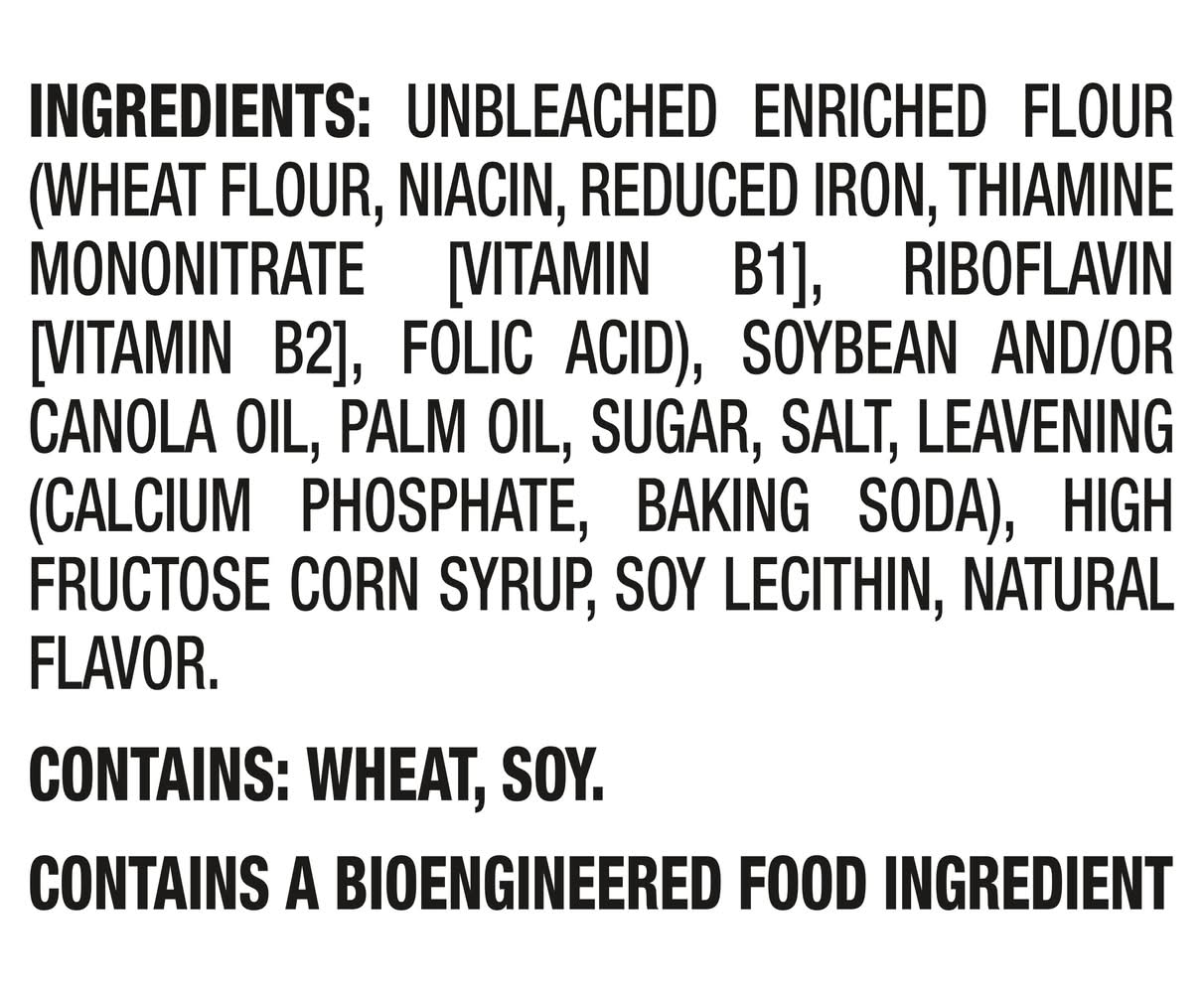 Ingredients: INGREDIENTS: UNBLEACHED ENRICHED FLOUR (WHEAT FLOUR, NIACIN, REDUCED IRON, THIAMINE MONONITRATE [VITAMIN B1], RIBOFLAVIN [VITAMIN B2], FOLIC ACID), SOYBEAN AND, OR CANOLA OIL, PALM OIL, SUGAR, SALT, LEAVENING (CALCIUM PHOSPHATE, BAKING SODA), HIGH FRUCTOSE CORN SYRUP, SOY LECITHIN, NATURAL FLAVOR. CONTAINS: WHEAT, SOY. Contains: Soy, Wheat