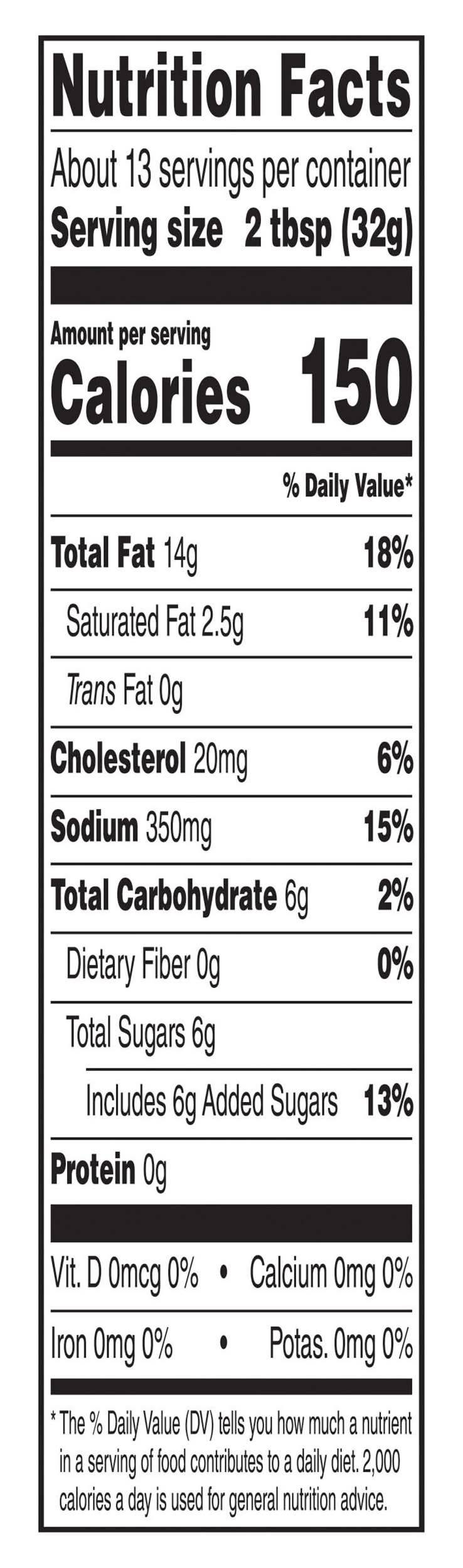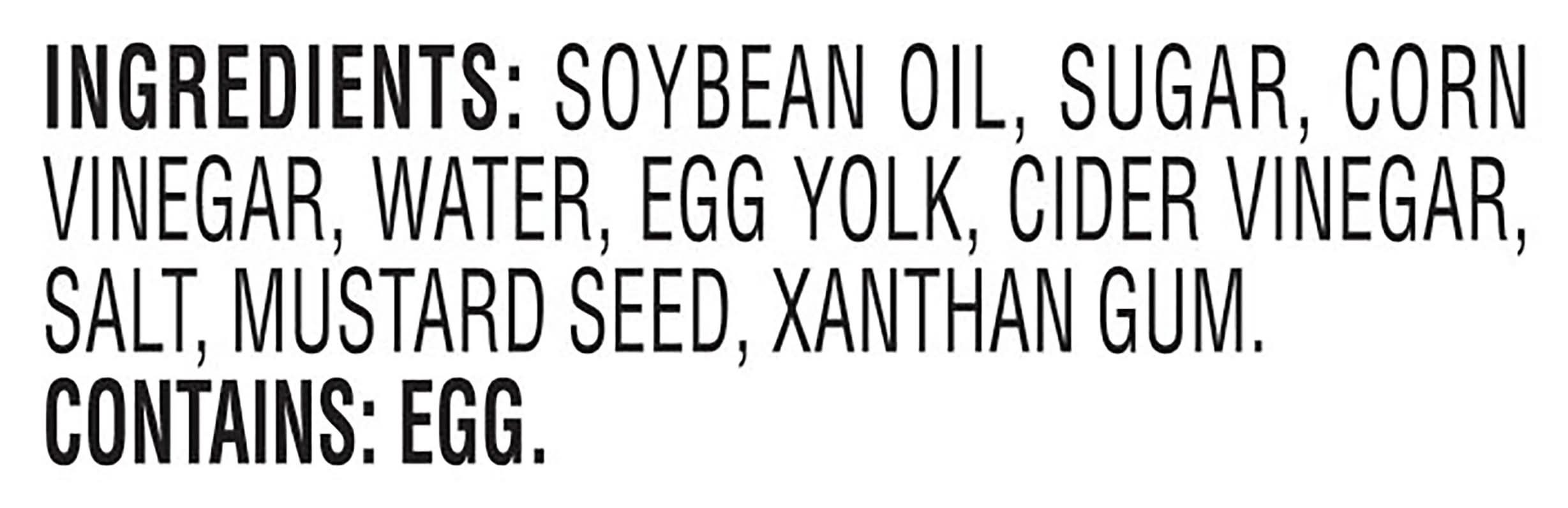 Ingredients: Soybean Oil, Sugar, Corn Vinegar, Water, Egg Yolk, Cider Vinegar, Salt, Mustard Seed, Xanthan Gum Contains: Eggs, Soybeans, Corn, Mustard