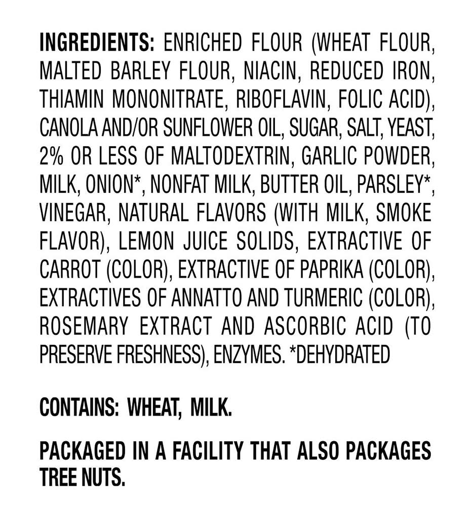 Ingredients: Enriched Flour (Wheat Flour, Malted Barley Flour, Niacin, Reduced Iron, Thiamin Mononitrate, Riboflavin, Folic Acid), Canola and/or Sunflower Oil, Sugar, Salt, Yeast, 2% or Less of Maltodextrin, Garlic Powder, Milk, Onion (Dehydrated), Nonfat Milk, Butter Oil, Parsley (Dehydrated), Vinegar, Natural Flavors (with Milk, Smoke Flavor), Lemon Juice Solids, Extractive of Carrot (Color), Extractive of Paprika (Color), Extractives of Annatto and Turmeric (Color), Rosemary Extract and Ascorbic Acid (to Preserve Freshness), Enzymes Contains: Wheat, Milk