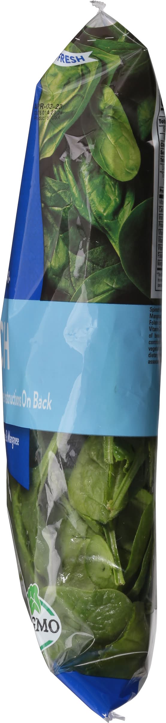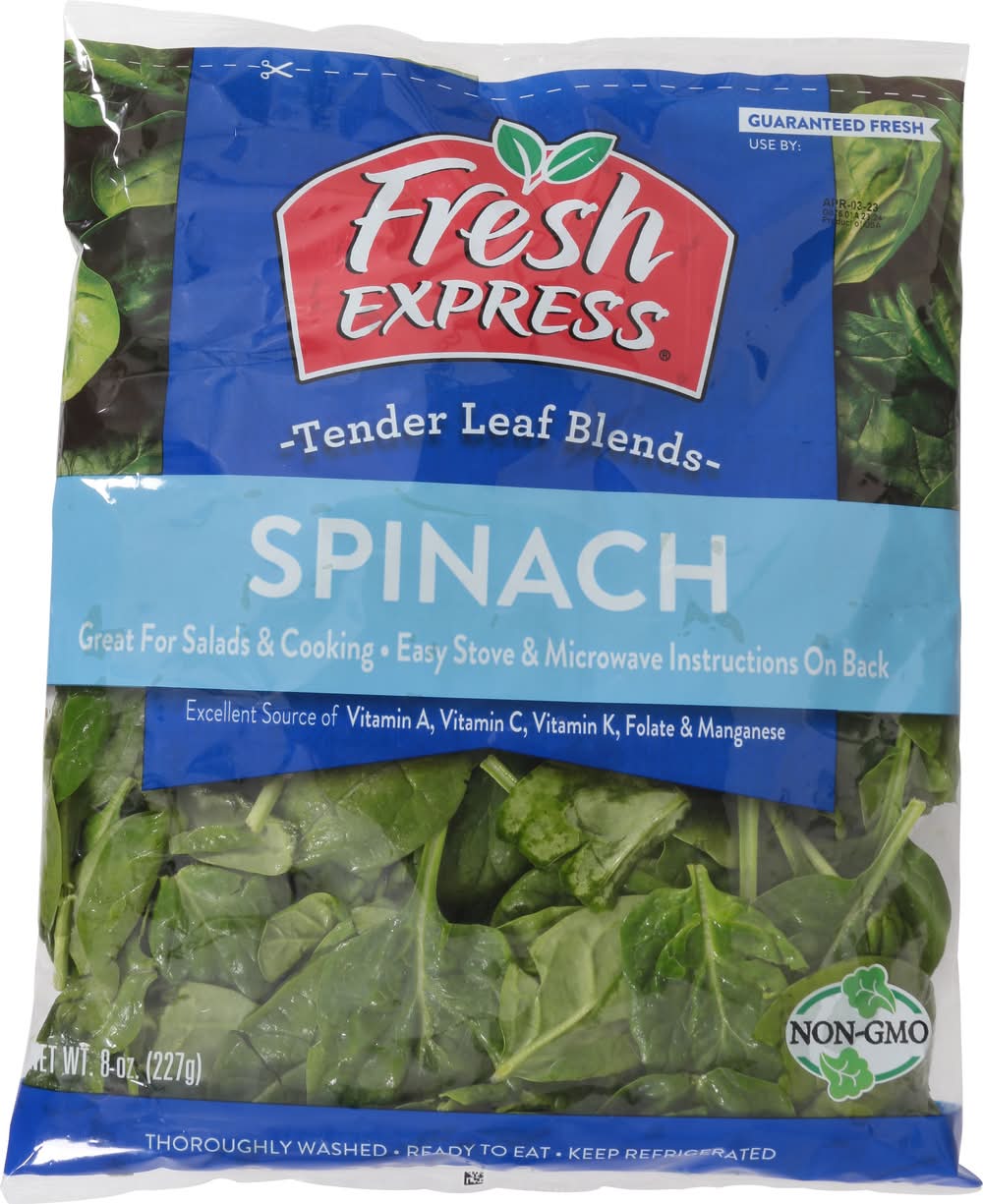 Great for salads or cooking. Easy stove & micro instructions on back. Keep refrigerated. Reseal for freshness. Excellent source of vitamin a + vitamin C + vitamin K + folate + manganese. Good source of potassium. Guaranteed fresh. No preservatives. Spinach is an excellent source of vitamin A, vitamin C & folate. Vitamin A contributes to the maintenance of normal vision, vitamin C & folate contribute to the reduction of fatigue. It is also an excellent source of vitamin K & manganese, which help maintain healthy bones. It is a good source of potassium which helps maintain normal blood pressure. Low fat diets rich in fruits and vegetables (foods that are low in fat and contain vitamin A, vitamin C and dietary fiber) may reduce the risk of some types of cancer, a disease associated with many factors. Why we're so fresh! Why we're so fresh! To guarantee Fresh Express salads are consistently, deliciously fresh, we: cool our salads within hours of harvest and keep them chilled from field to store; thoroughly rinse and gently dry; then seal them in our keep-crisp bag to maintain freshness; and deliver fresh salads daily. Fresh Express Promise: Fresh guaranteed! At Fresh Express, we are passionate about delivering the freshest, highest quality salads possible! Our team of food scientists and agricultural experts are committed to exceeding industry standards so we can guarantee the freshest of our salads, every single day. Fruits & veggies - more matters.