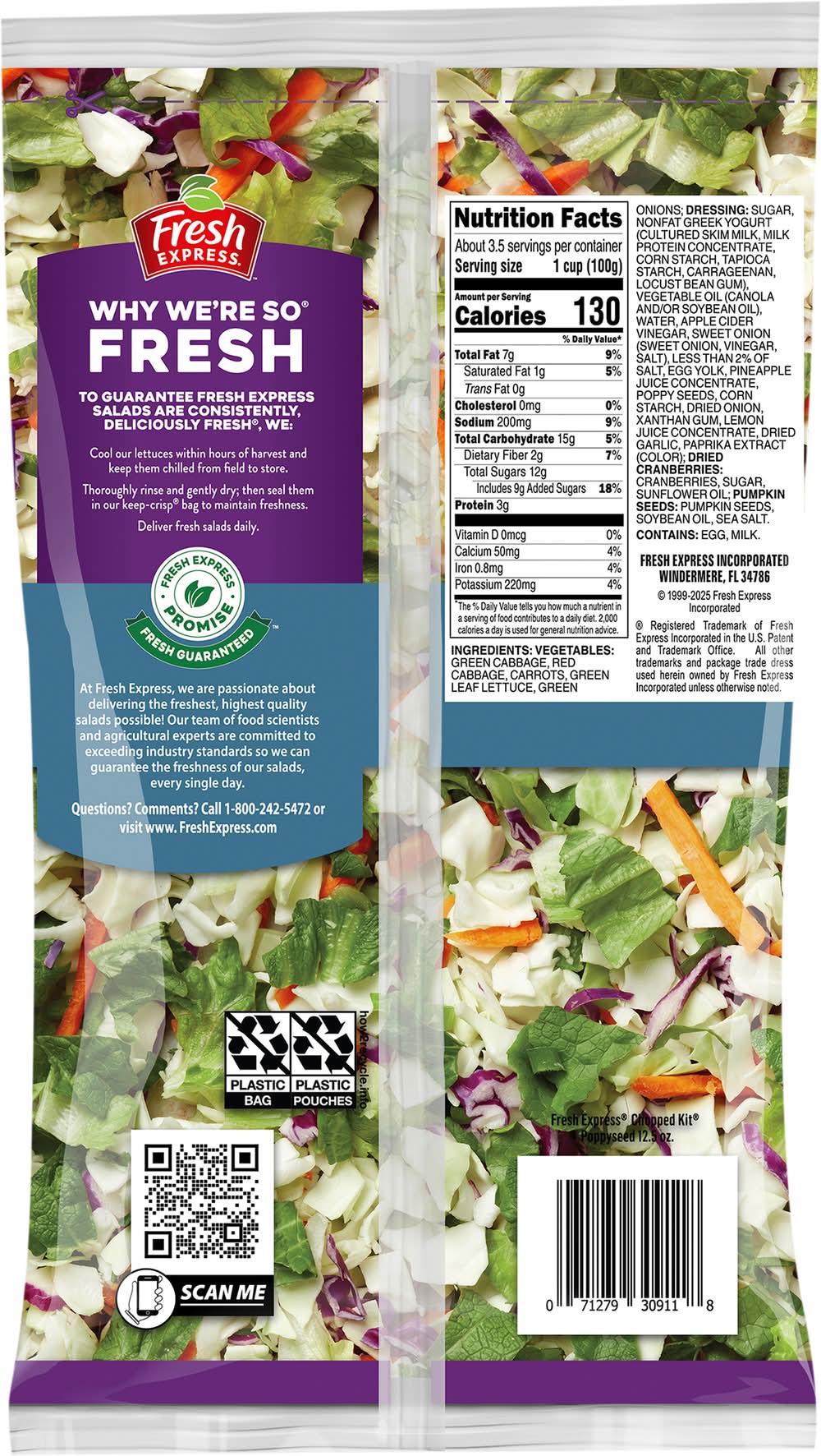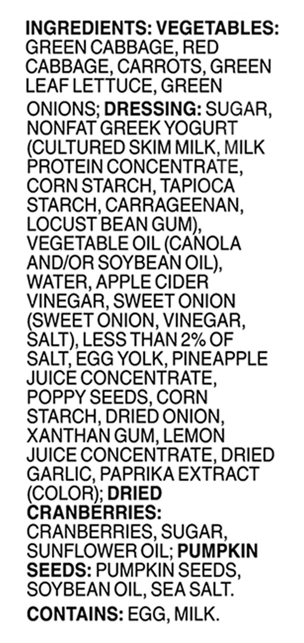 Ingredients: Vegetables: Green Cabbage, Red Cabbage, Carrots, Green Leaf Lettuce, Green Onions; Dressing: Sugar, Nonfat Greek Yogurt (Cultured Skim Milk, Milk Protein Concentrate, Corn Starch, Tapioca Starch, Carrageenan, Locust Bean Gum), Vegetable Oil (Canola and/or Soybean Oil), Water, Apple Cider Vinegar, Sweet Onion (Sweet Onion, Vinegar, Salt), Less than 2% of Salt, Egg Yolk, Pineapple Juice Concentrate, Poppy Seeds, Corn Starch, Dried Onion, Xanthan Gum, Lemon Juice Concentrate, Dried Garlic, Paprika Extract (Color); Dried Cranberries: Cranberries, Sugar, Sunflower Oil; Pumpkin Seeds: Pumpkin Seeds, Soybean Oil, Sea Salt Contains: Eggs, Milk, Soybeans