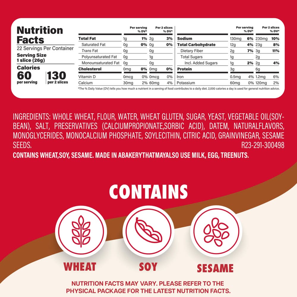 Ingredients: WHOLE WHEAT FLOUR, WATER, WHEAT GLUTEN, SUGAR, YEAST, VEGETABLE OIL (SOYBEAN), SALT, PRESERVATIVES [CALCIUM PROPIONATE, SORBIC ACID], DATEM, NATURAL FLAVOR, MONOGLYCERIDES, MONOCALCIUM PHOSPHATE, SOY LECITHIN, CITRIC ACID, GRAIN VINEGAR, SESAME SEEDS. Contains: CONTAINS SESAME, SOY, WHEAT.