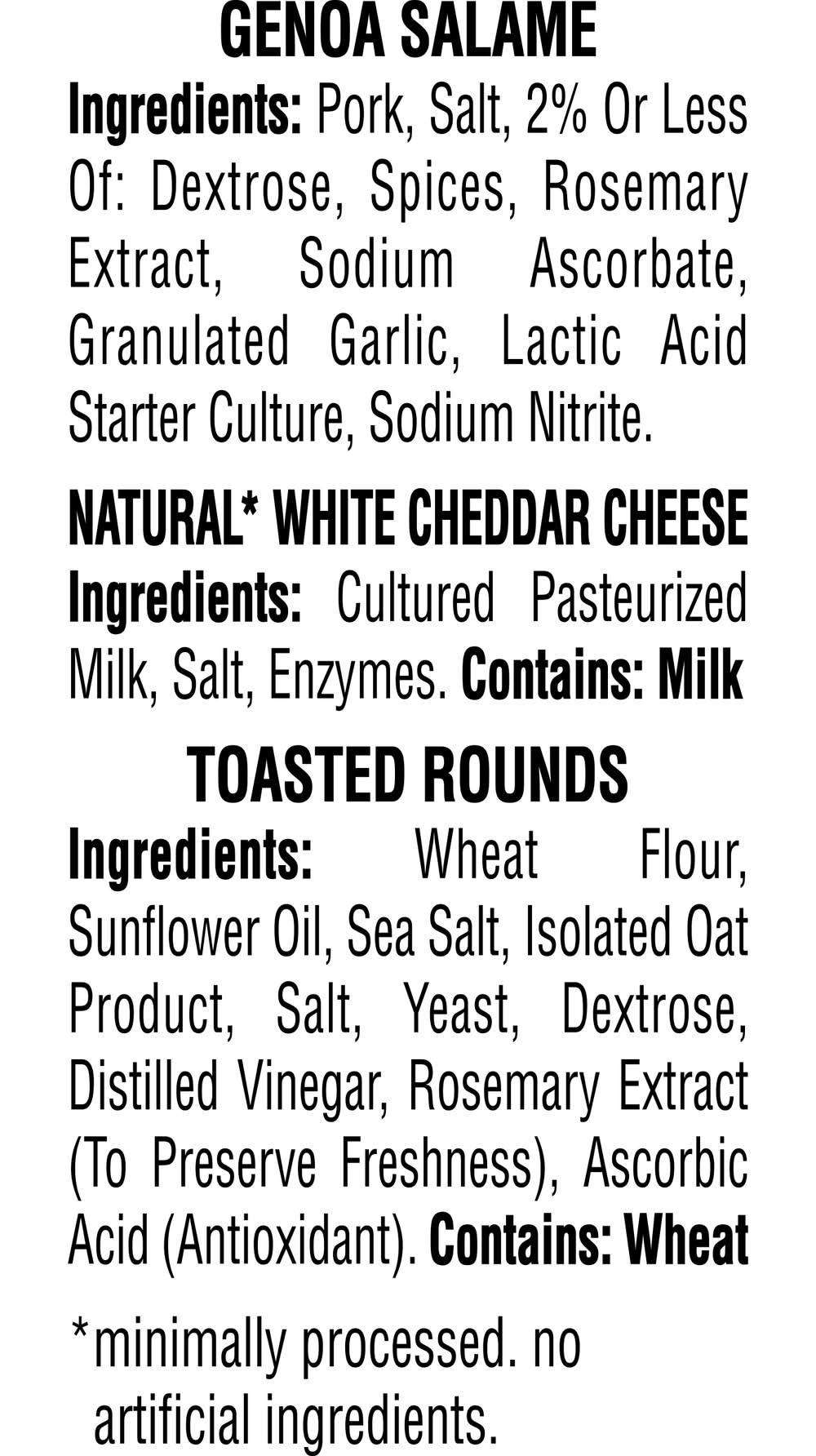 Ingredients: Genoa Salame Ingredients: Pork, Salt, Contains 2% Or Less Of: Dextrose, Spices, Rosemary Extract, Sodium Ascorbate, Granulated Garlic, Lactic Acid Starter Culture, Sodium Nitrite. Natural White Cheddar Cheese Ingredients: Cultured Pasteurized Milk, Salt, Enzymes. Toasted Rounds Ingredients: Wheat Flour, Sunflower Oil, Sea Salt, Isolated Oat Product, Salt, Yeast, Dextrose, Distilled Vinegar, Rosemary Extract (To Preserve Freshness), Ascorbic Acid (Antioxidant). Contains: Milk, Wheat