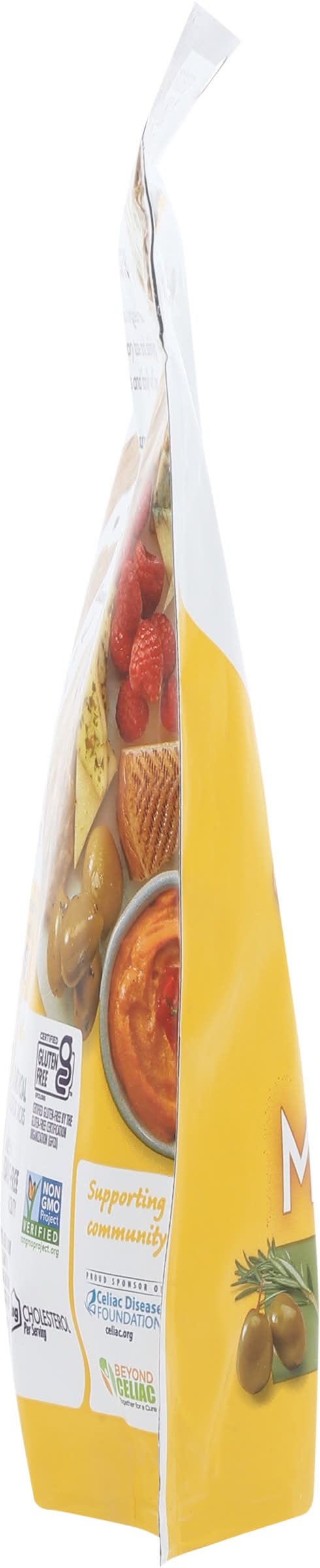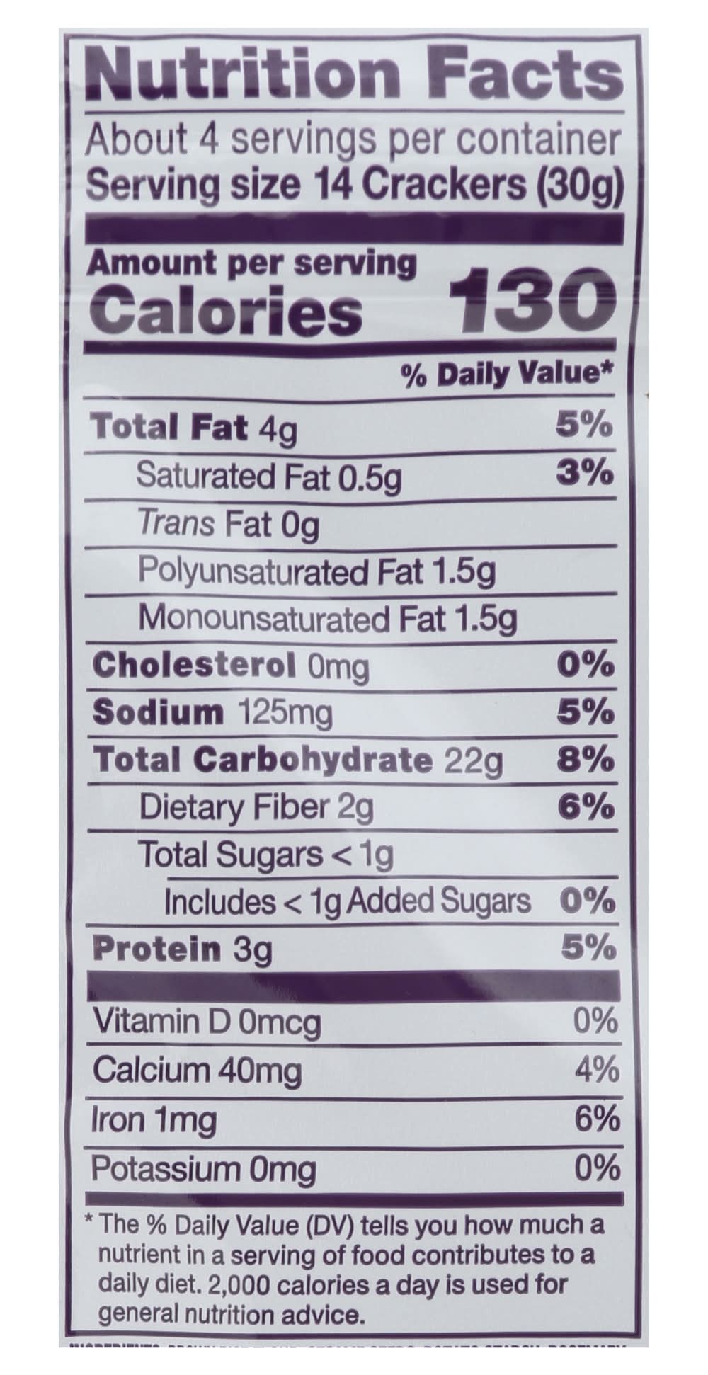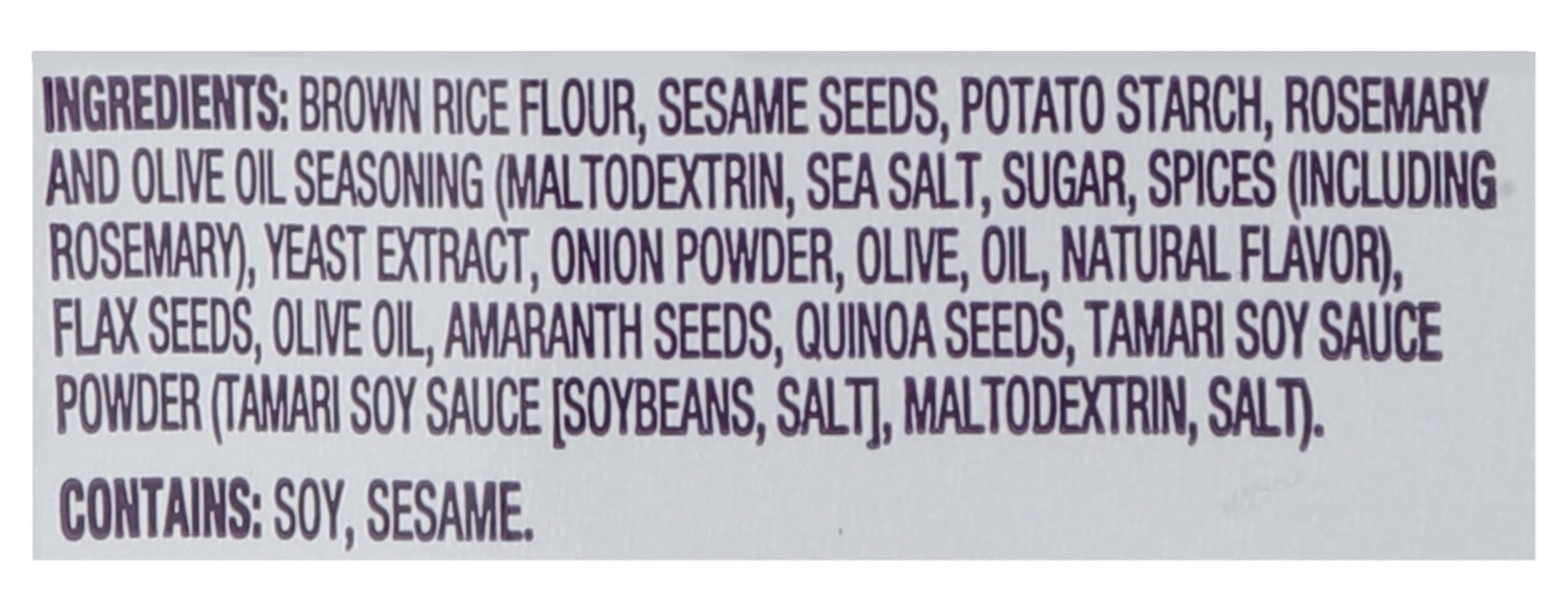 Ingredients: Brown Rice Flour, Sesame Seeds, Potato Starch, Rosemary and Olive Oil, Seasoning (Maltodextrin, Sea Salt, Sugar, Spices (Including Rosemary), Yeast Extract, Onion Powder, Olive, Oil, Natural Flavor), Flax Seeds, Olive Oil, Amaranth Seeds, Quinoa Seeds, Tamari Soy Sauce Powder (Tamari Soy Sauce (Soybeans, Salt), Maltodextrin, Salt) Contains: Soybeans, Sesame