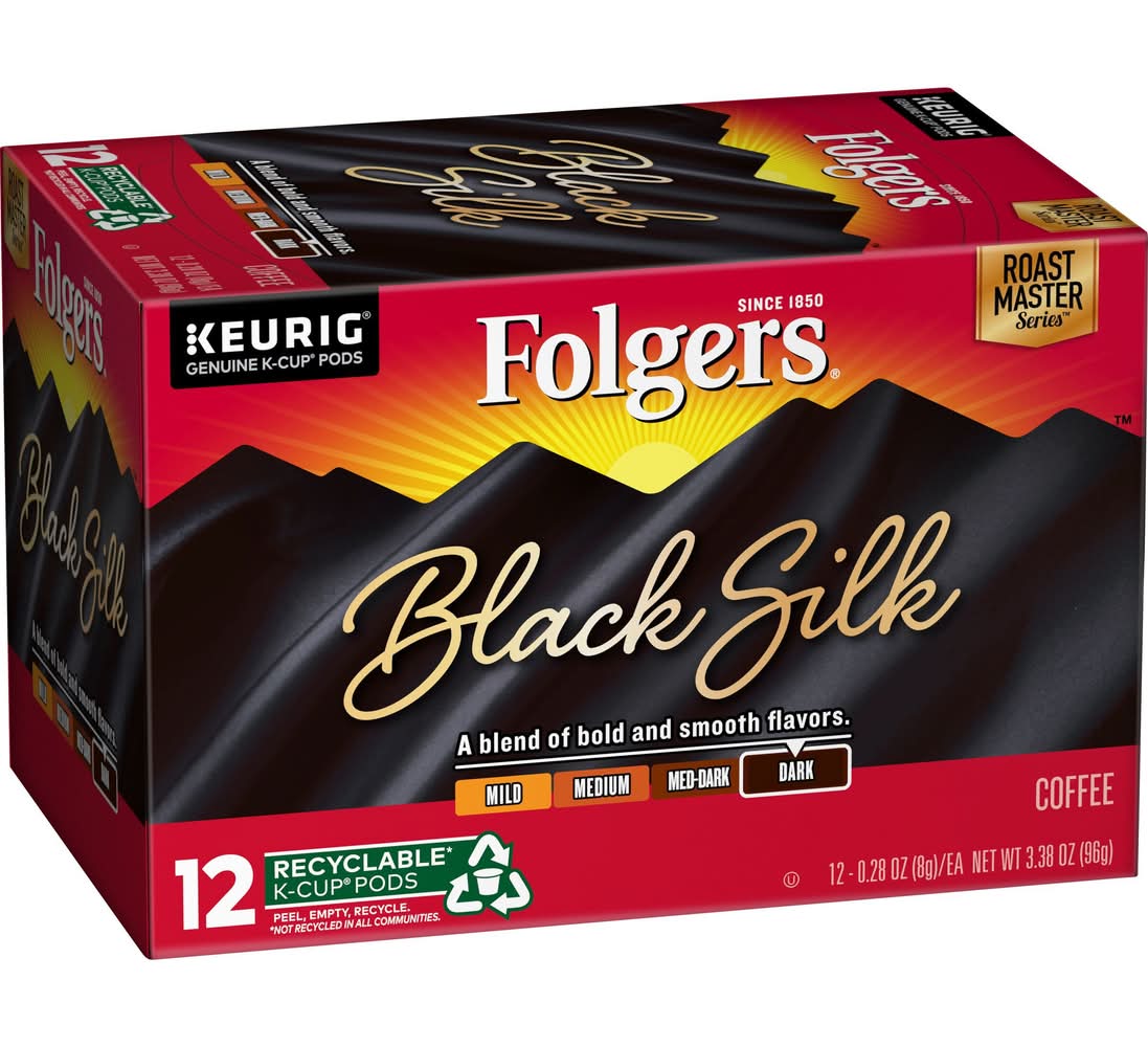 Wake up to a bold, yet exceptionally smooth blend with a rich, robust taste. Folgers Black Silk Coffee is just what dark-roast coffee fans are looking for. The best part of wakin' up is now the convenience in your cup! With Folgers K-Cup Pods, there's no measuring and no filter. Just place your K-Cup Pod in your Keurig Brewer and, in less than a minute, you can enjoy one perfectly brewed cup of Folgers Coffee. • Brand: Folgers • Jm Smucker, Orrville, OH 44667 • Packaging: Reusable