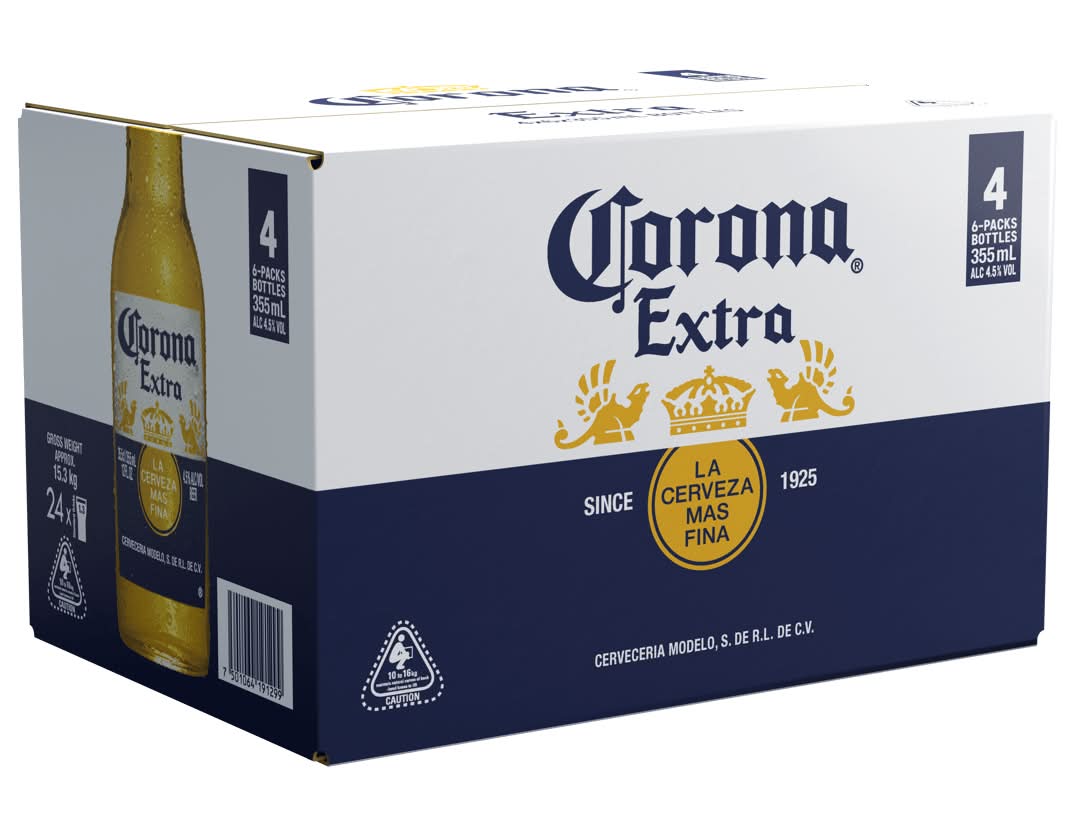 Alcohol Percentage: 4.5% | Corona is famous around the world for its smooth, refreshing taste. It displays a well-rounded character with pleasant malt and hop aromas. Garnish with a wedge of lime to heighten the citrus aromas and flavours. • Pack size: 24 • Packaging: Reusable