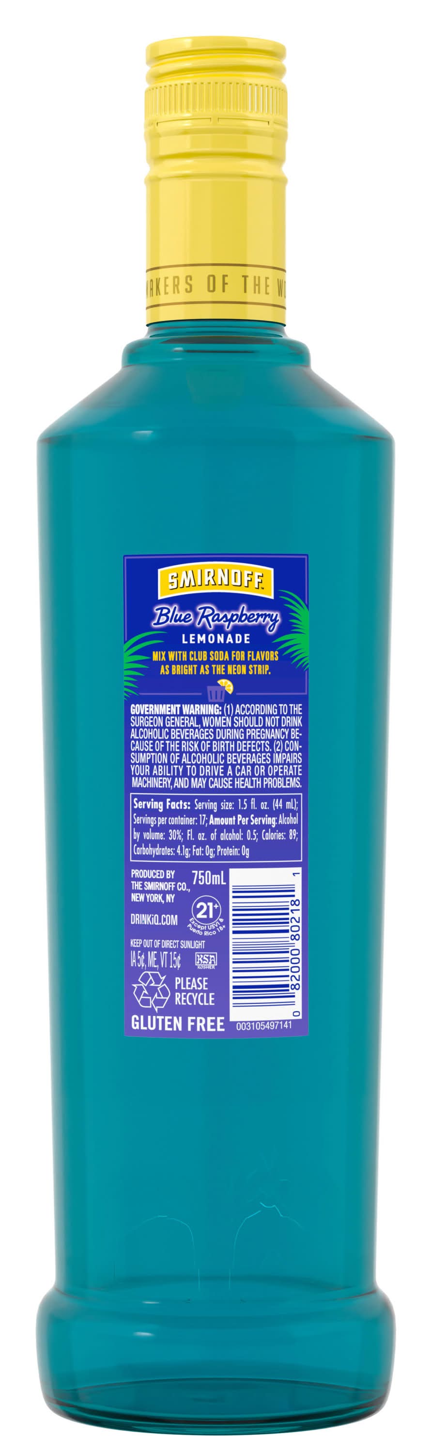 Indulge in Nostalgia With Smirnoff Blue Raspberry Lemonade. It Offers a Bright Blue Raspberry Aroma Mixed With Nostalgic Cotton Candy and Zesty Lemonade. the Flavors of Sweet Blue Raspberry Are Balanced by a Slightly Tart, Zesty Lemonade With a Lingering Blue Raspberry Finish. Best Enjoyed With Club Soda and Ice or As a Shot to Celebrate a Hot Summer Night. • Brand: Smirnoff • Flavor: Blue raspberry-lemonade • Alcohol by volume: 30.5% • Flavor: raspberry • Diageo, 300 Park Avenue, NY 10022 • Packaging: Reusable