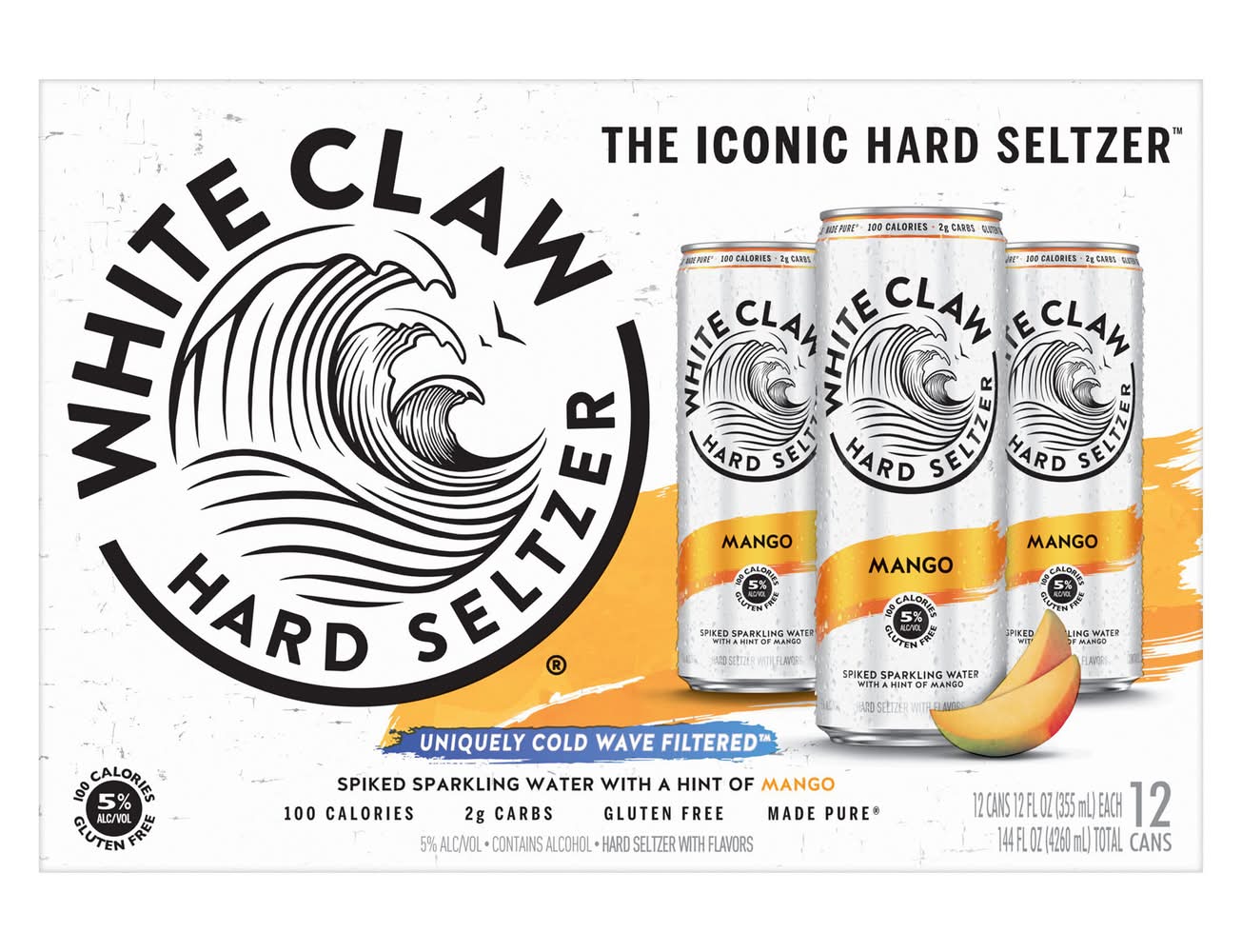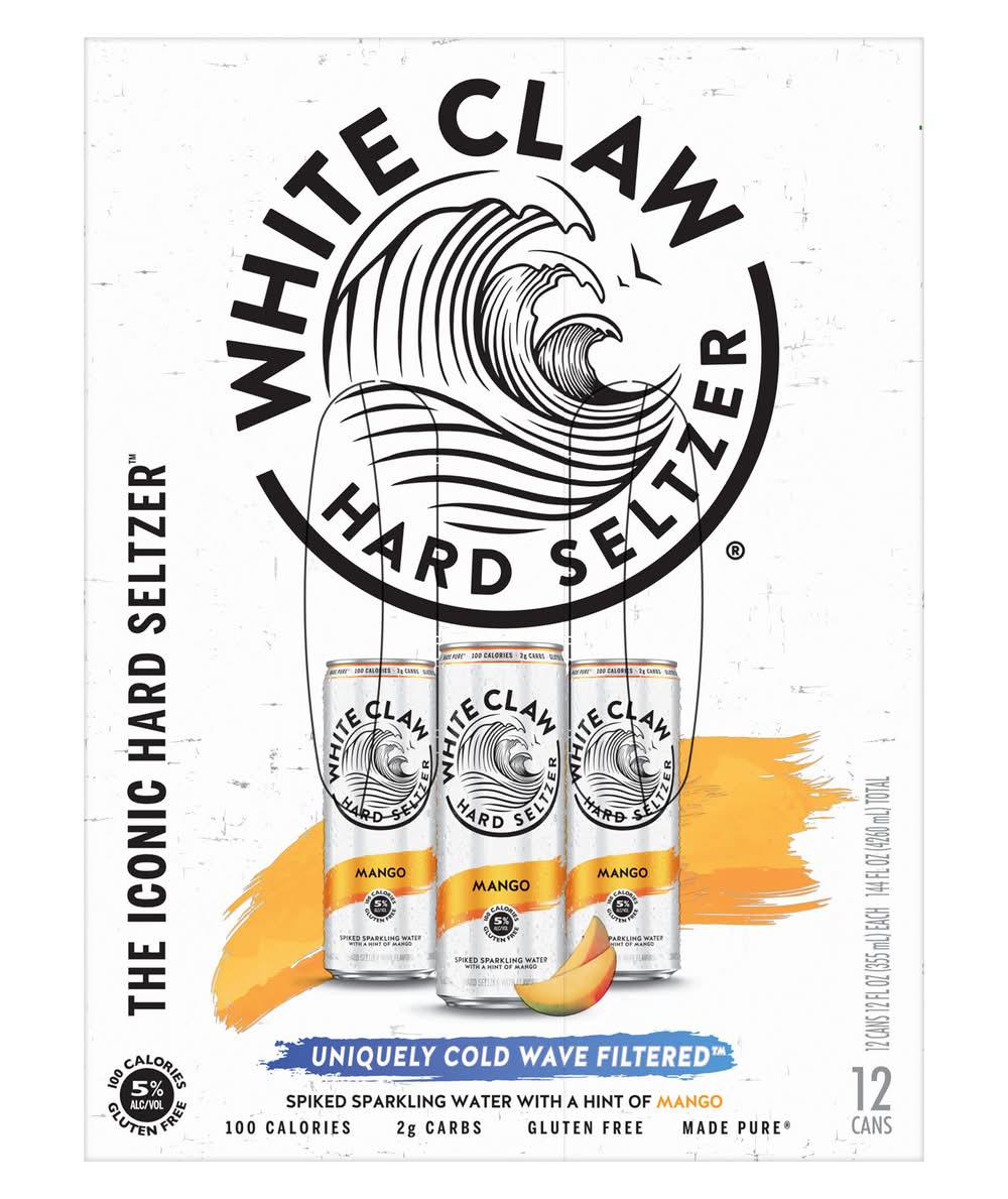 Discover a wave of pure, crisp taste refreshment Hard Seltzer Mango. Crafted with quality ingredients, White Claw Mango is made from a blend of seltzer water, gluten-free alcohol, and a hint of Mango. Each 12oz can contains 100 calories, 5% alcohol, and 2g of carbs, making it the perfect choice to share the crisp, refreshing taste of White Claw. Please drink responsibly. 21+. • Brand: White claw • Flavor: Assorted • Pack size: 12 • gluten-free • Alcohol by volume: 5% • Mark Anthony Brands Inc., Chicago,IL,60661 • Packaging: Reusable