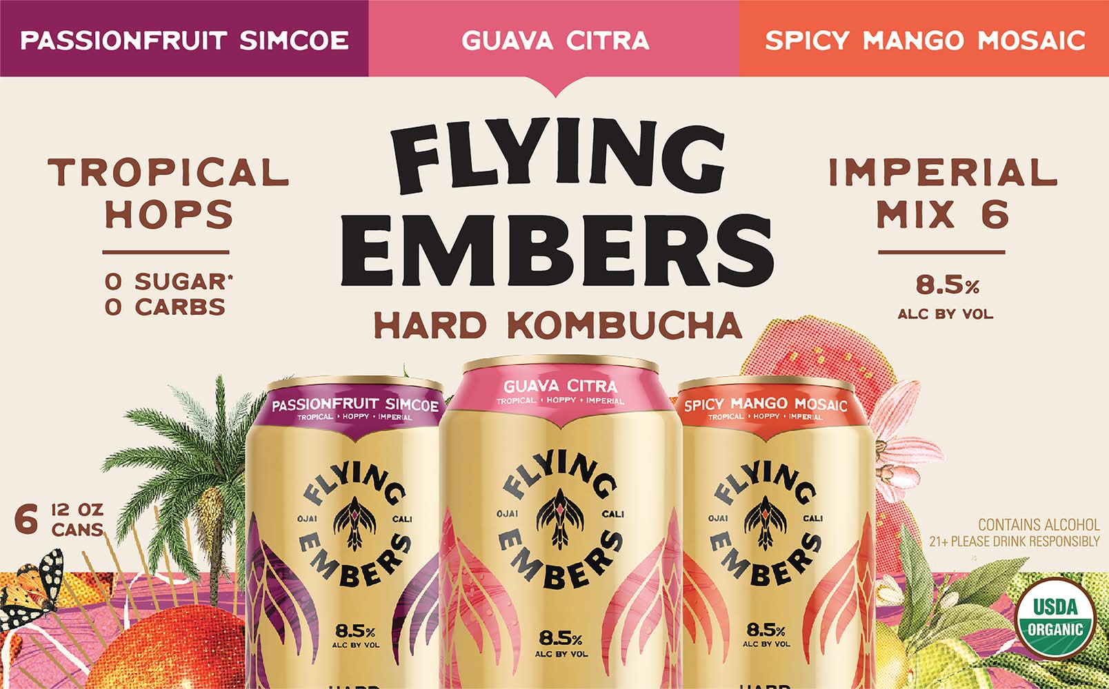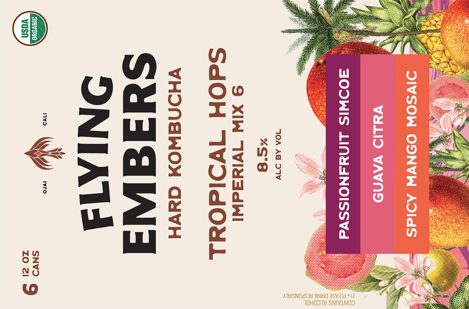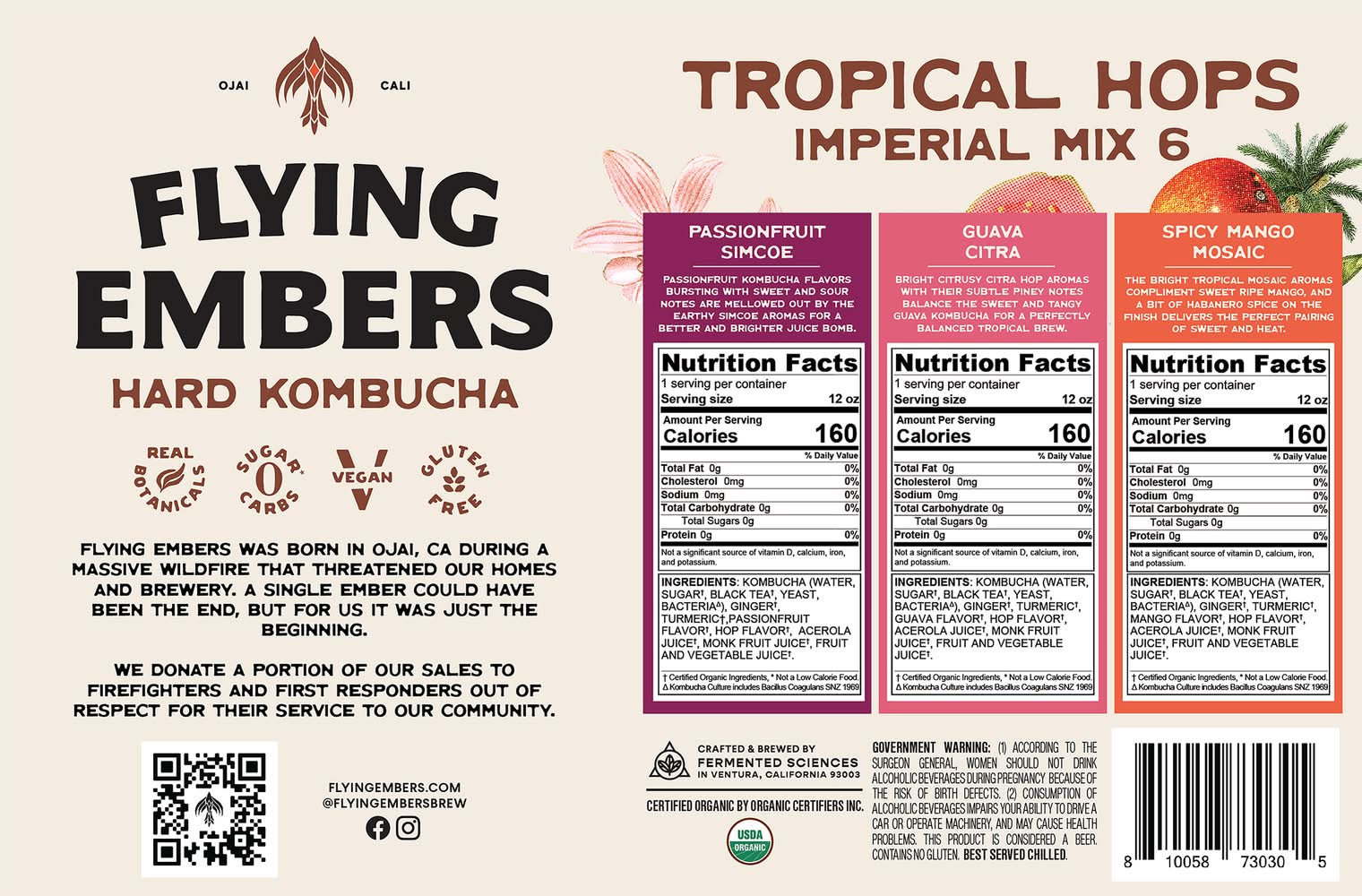 21+ Passionfruit Simcoe: Passionfruit kombucha flavors bursting with sweet and sour notes are mellowed out by the earthy Simcoe aromas for a better and brighter juice bomb. Guava Citra: Bright citrusy Citra hop aromas with their subtle piney notes balance the sweet and tangy guava kombucha for a perfectly balanced tropical brew. Spicy Mango Mosaic: The bright tropical mosaic aromas compliment sweet ripe mango, and a bit of habanero spice on the finish delivers the perfect pairing of sweet and heat. 0 sugar (Not a low calorie food). 0 carbs. Please drink responsibly. Real botanicals. was born in Ojai, CA during a massive wildfire that threatened our homes and brewery. A single ember could have been the end, but for us it was just the beginning • Brand: Flying embers • Flavor: Assorted • Pack size: 6 • vegan, gluten-free, organic, • Alcohol by volume: 8.5% • Number of servings: 1