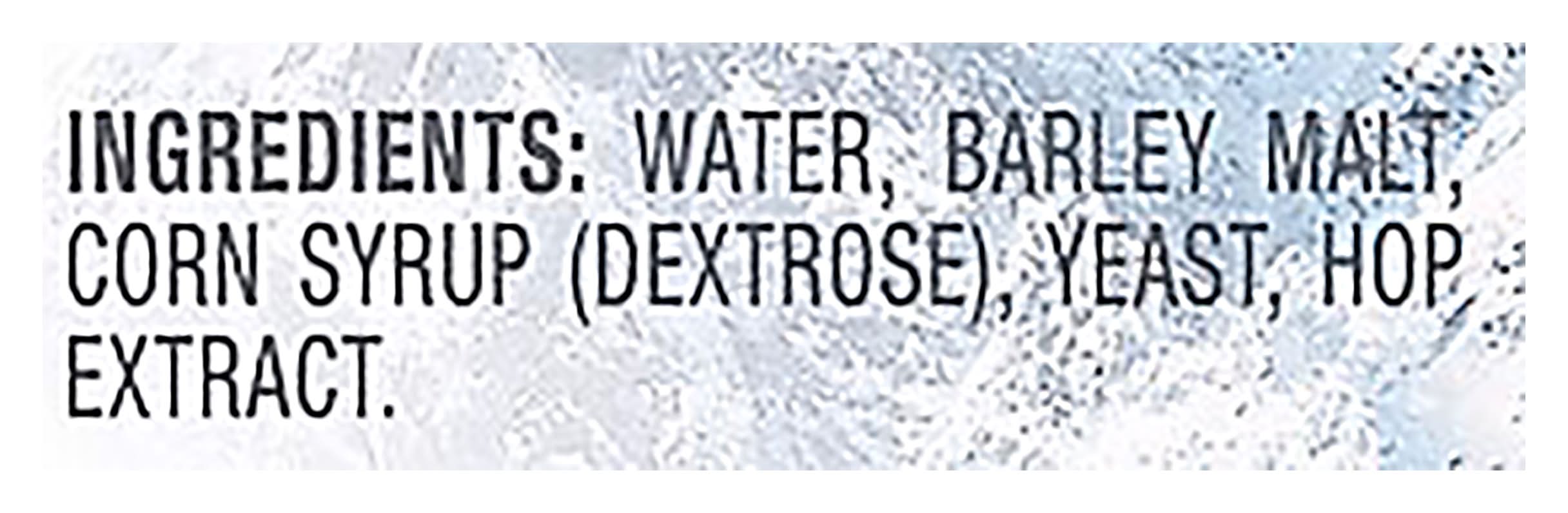 Ingredients: Water, Barley Malt, Corn Syrup (Dextrose)*, Yeast, Hop Extract *Not HFCS, Not present in the final product