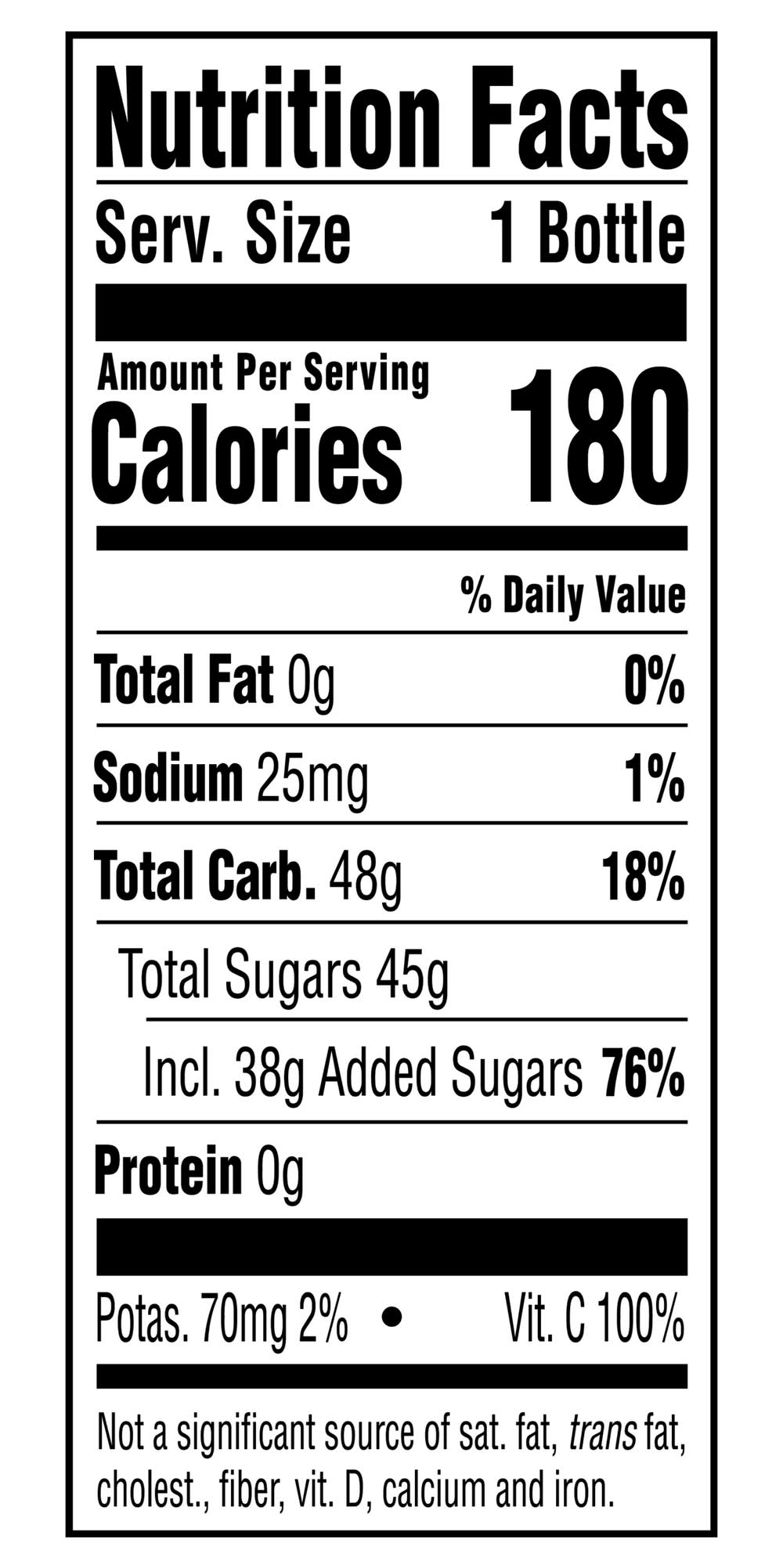25% blend of pear, cranberry, apple & raspberry juices from concentrate. Flavored juice beverage with other natural flavors. 180 calories per bottle. 100% Vit C. Put good in. Get good out. Pasteurized. • Brand: Minute maid • Flavor: Cranberry apple raspberry • The coca-cola company, Atlanta, GA, 30313 • Packaging: Reusable
