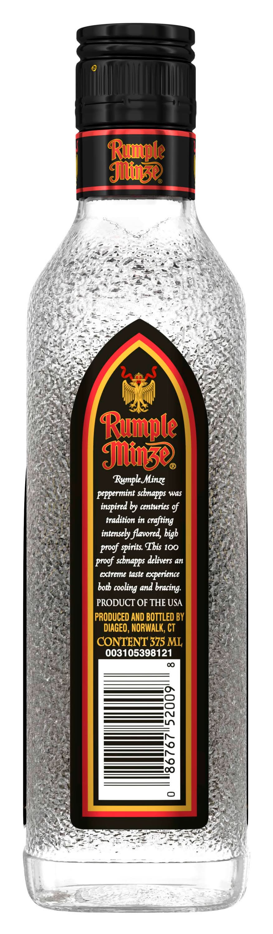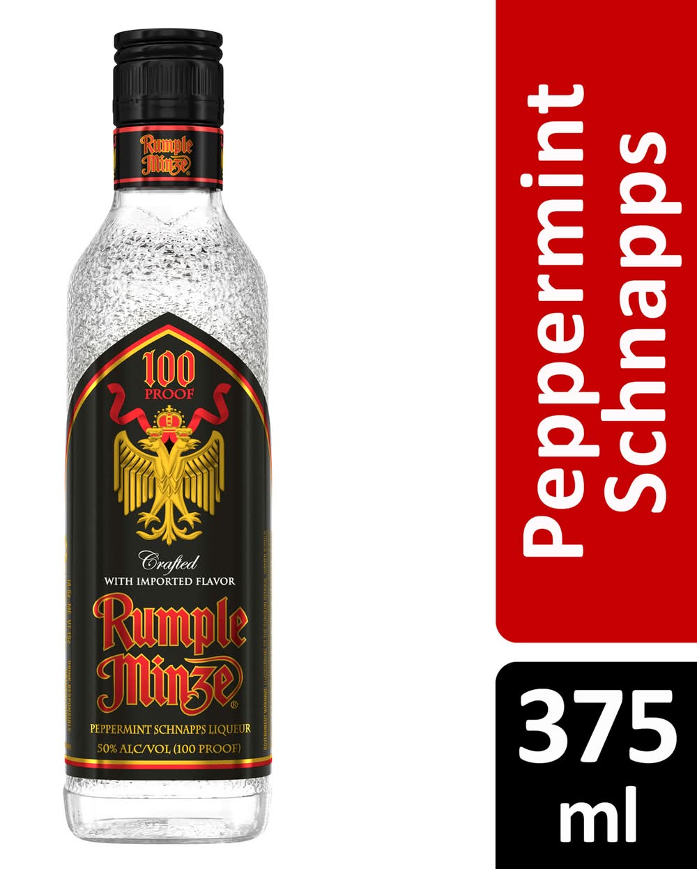 Enjoy the cooling and bracing experience of Rumple Minze Peppermint Schnapps. The unmistakable taste of fresh and crisp peppermint followed by a silky-smooth, extended finish will take your breath away. Famous for shots and daring cocktails, this 100 proof peppermint flavored liqueur is a holiday favorite and enjoyed best in the company of friends. Serve in a chilled shot glass for a refreshing tasting kick. Includes one 100 proof 375 mL bottle of Peppermint Schnapps. Please drink responsibly. • Brand: Rumple minze • Category: Liqueur, cordials, & schnapps • Alcohol by volume: 50%