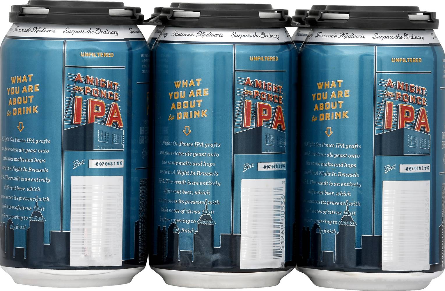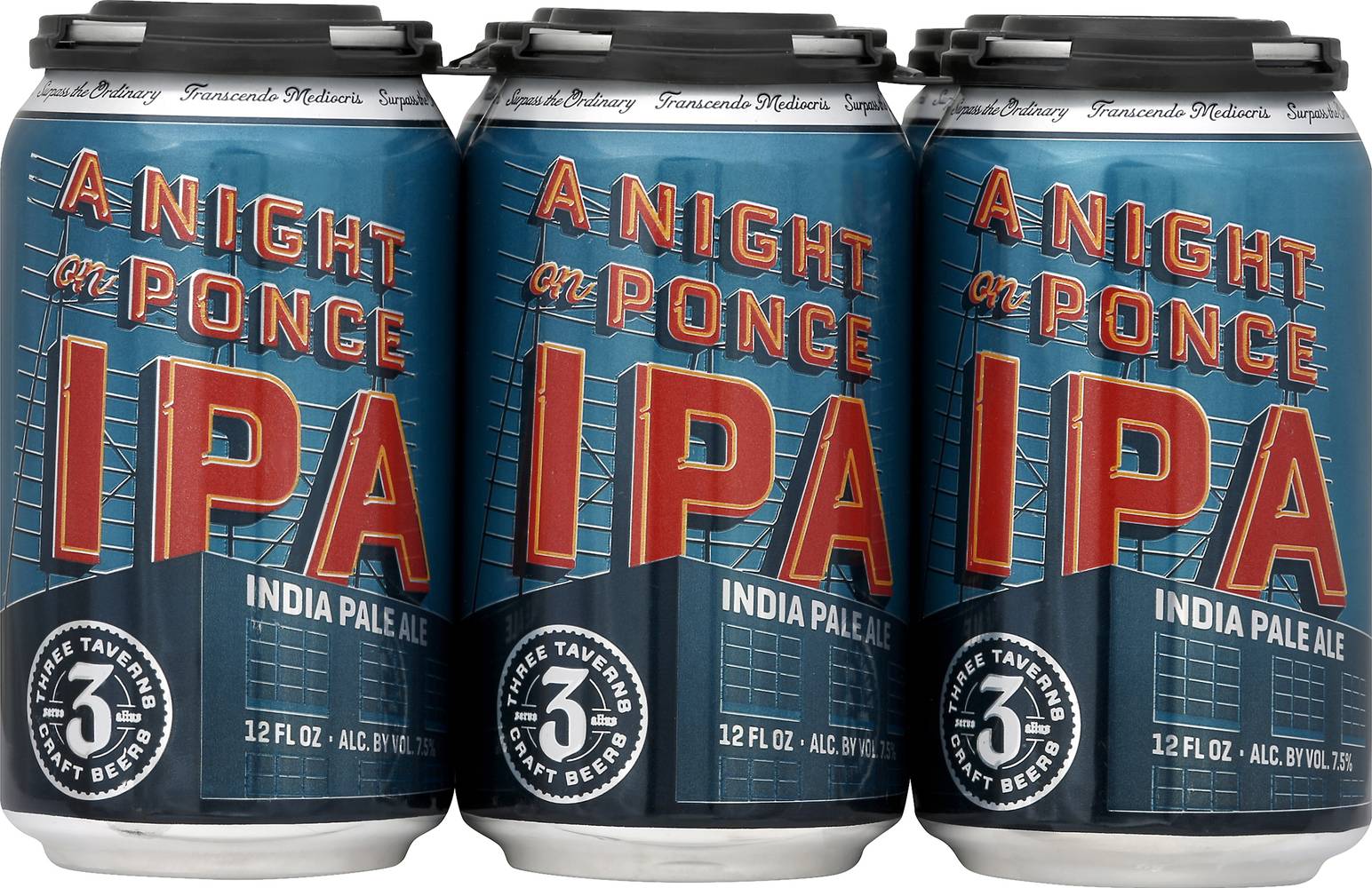 At night on ponce IPA. Three Taverns 3 Craft beers. What you are about to drink. A night on ponce IPA grafts on American ale yeast on to the same malts and hops used in a night in brussels IPA. The result is an entirely different beer, which announces its presence with lush notes of citrus fruit before tapering to clean, dry finish. Visit us at threetavernsbrewery.com. Cheers! Alc 7.5% by vol. Brewed and canned by Three Taverns Craft Brewery Decatur, GA USA. • Brand: Three taverns • Category: Ipa • Pack size: 6 • Alcohol by volume: 7.5% • Medium bodied • Suggested glassware: snifter/goblet/chalice