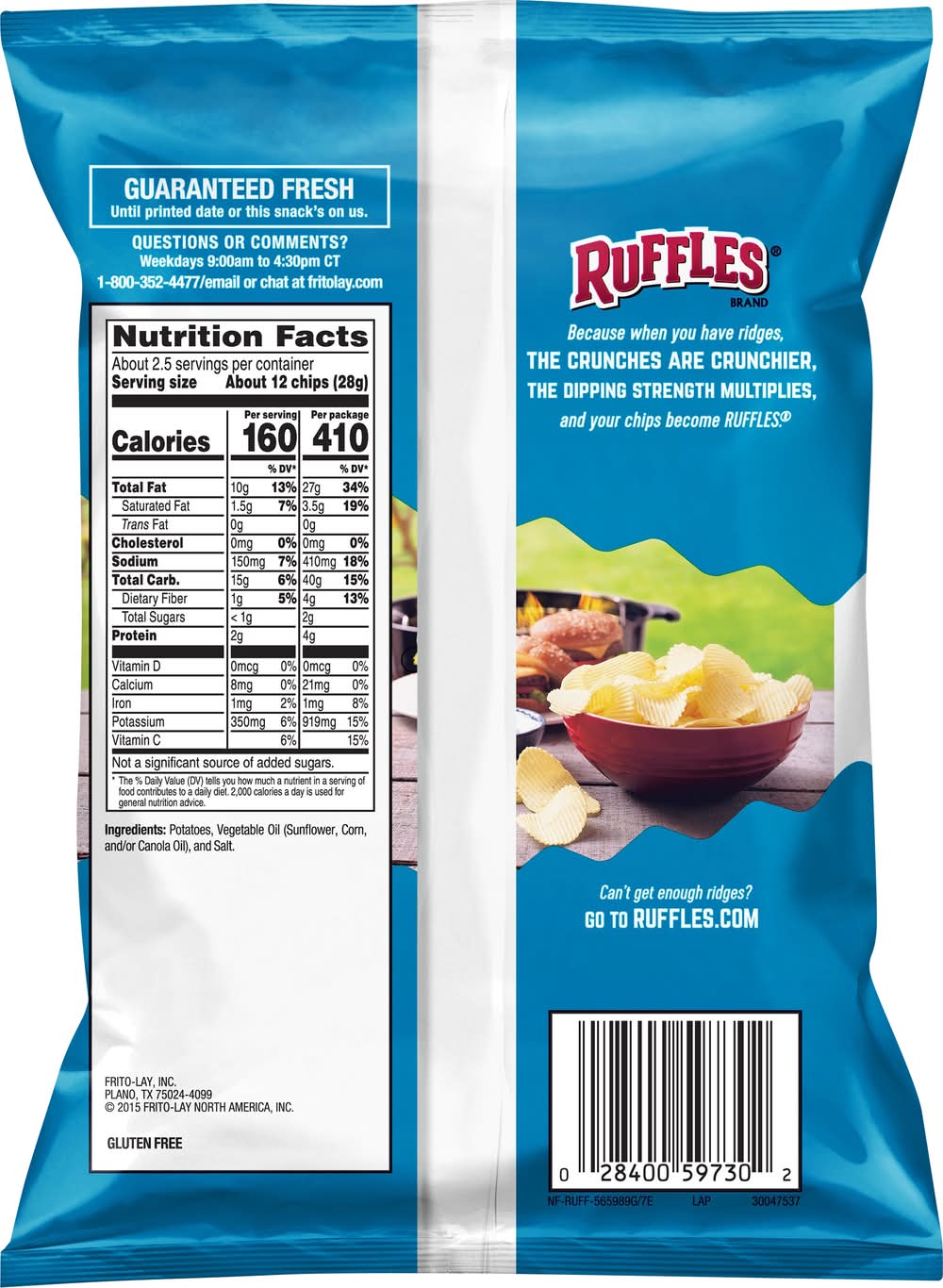 Gluten free. Ruffles have Ridges! Because when you have ridges, the crunches are crunchier, the dipping strength multiplies, and your chips become Ruffles. • Brand: Ruffles • kosher, gluten-free • Number of servings: 2 • Frito-Lay, Inc., Plano, TX, 75024-4099, Ph: 800-352-4477