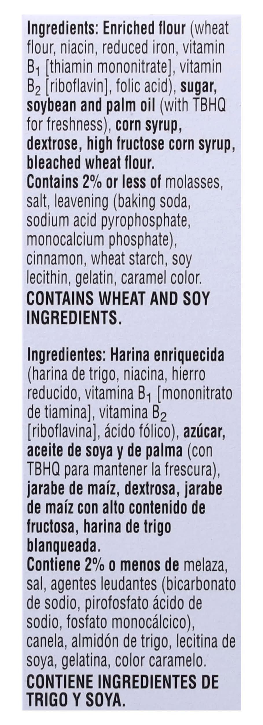 Ingredients: Enriched Flour (Wheat Flour, Niacin, Reduced Iron, Vitamin B1 [Thiamin Mononitrate], Vitamin B2 [Riboflavin], Folic Acid), Sugar, Soybean And Palm Oil (With Tbhq For Freshness), Corn Syrup, Dextrose, High Fructose Corn Syrup, Bleached Wheat Flour. Contains 2% Or Less Of Molasses, Salt, Leavening (Baking Soda, Sodium Acid Pyrophosphate, Monocalcium Phosphate), Cinnamon, Wheat Starch, Soy Lecithin, Gelatin, Caramel Color. Contains: Wheat, Soybeans, Corn