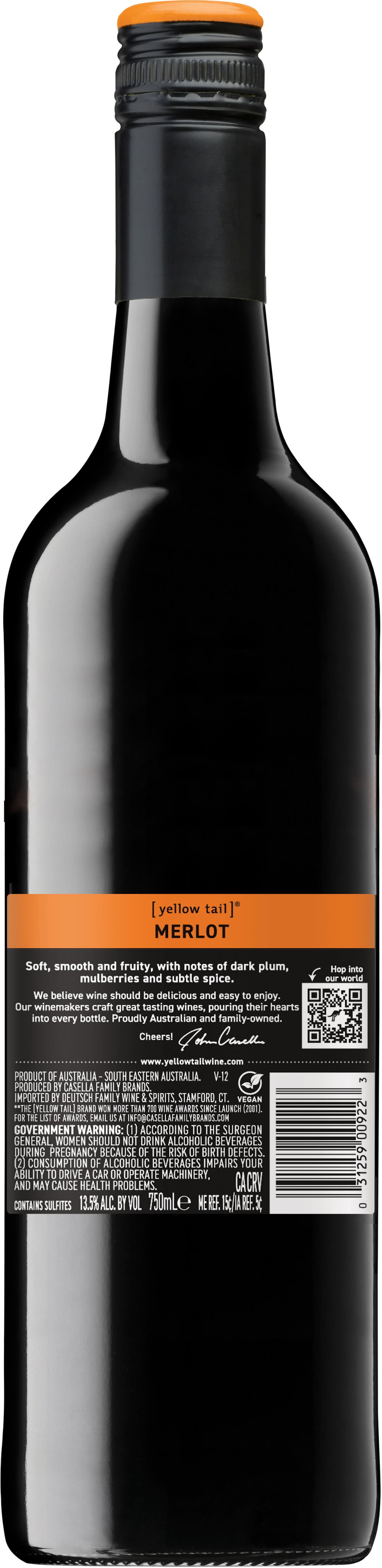 Made in South Eastern Australia, yellow tail Merlot is a red wine that brings the flavors and essence of the region to your glass, ensuring a smile with each sip. This merlot is everything a great wine should be with its easy to drink, velvety taste and smooth flavor profile. Featuring soft flavors of dark plums, mulberries and spice, this red wine is medium bodied with a lush finish. Enjoy this flavorful red wine with beef, cured meats or antipasto. Take an adventurous approach to this bottle of wine by making mulled wine or red hot chocolate, perfect for sharing with friends. wine is wonderful for livening up casual dinners with loved ones and bringing a lighthearted spirit to any and every event and celebration. This wine bottle is 750 ml and has a 13% ABV. Great quality wine can be affordable and good fun too. We like our wines to be vibrant, flavorsome and approachable, making everyday moments even more enjoyable. A wine for any occasion, is easy to choose, drink and enjoy. • Alcohol by volume: 13.5% • 2019