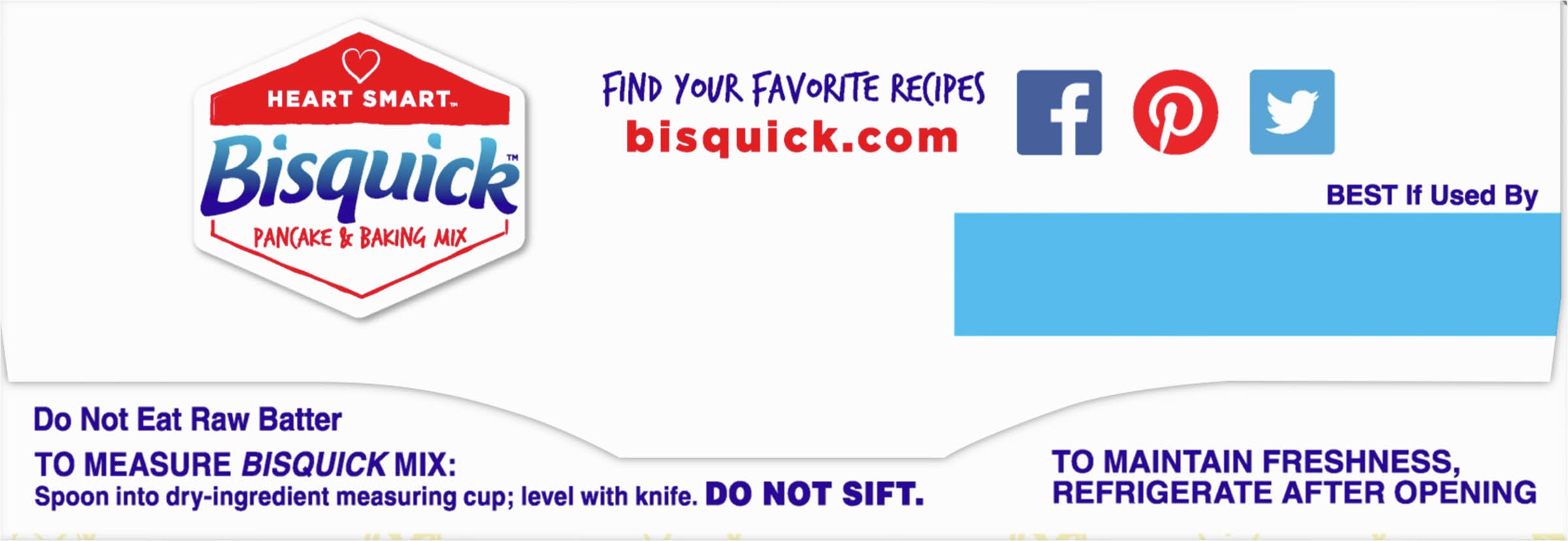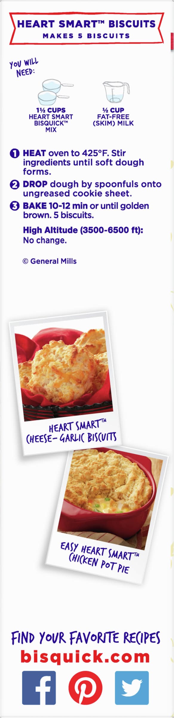 Directions for use: You will need: 1-3/2 cups Heart Smart Bisquick mix. 1/2 cup fat-free (skim) milk. 1. Heat oven to 425 degrees F. Stir ingredients until soft dough forms. 2. Drop dough by spoonfuls onto ungreased cookie sheet. 3 bake 10-12 min or until golden brown. 5 biscuits. High altitude (3500-6500 ft) no change. Heart Smart Pancakes Makes 14 pancakes. You will Need: 2 cups Heart Smart Bisquick mix. 1-1/4 cups fat-free (skim) milk. 1 egg. 1. Stir ingredients until blended. 2. Pour by slightly less than 1/4 cupfuls onto hot greased griddle. 3. Cook until edges are dry; about 1 minute 30 seconds. Turn; cook 1 minute 30 seconds or until golden. High altitude (3500-6500 ft): No change. For heart healthy pancakes. Just add the following ingredients in step one of our heart smart pancakes recipe. 1/3 cups fat-free (skim) milk. 2 egg whites. Waffles makes 12 (4-inch) waffles. You will Need: 2 cups heart smart Bisquick mix. 1-1/3 cups fat-free (skim) milk. 2 tsp vegetable oil. 1 egg. 1. Stir ingredients until blended. 2. Pour onto center of hot greased waffle maker. Close lid. Bake about 5 min or until steaming stops. Carefully remove waffle. High altitude (3500-6500 ft) increase milk to 1-1/2 cups. Make it your own. Stir 1 of your favorites into the Bisquick pancake or waffle recipe. Make it Fruity: Add 2/3 cup raisins. Make it Nutty: Add 1/4 cup chopped walnuts. Make it Tasty: Add 1/2 cup mashed banana. Make it Hearty: Add 1/2 cp quick cooking oats. Just Enough Fiber: Add 1 tsp chia seeds. Make it Moist: Add 2/3 cup yogurt. To maintain freshness, refrigerate after opening. Storage recommendation: To maintain freshness, refrigerate after opening.
