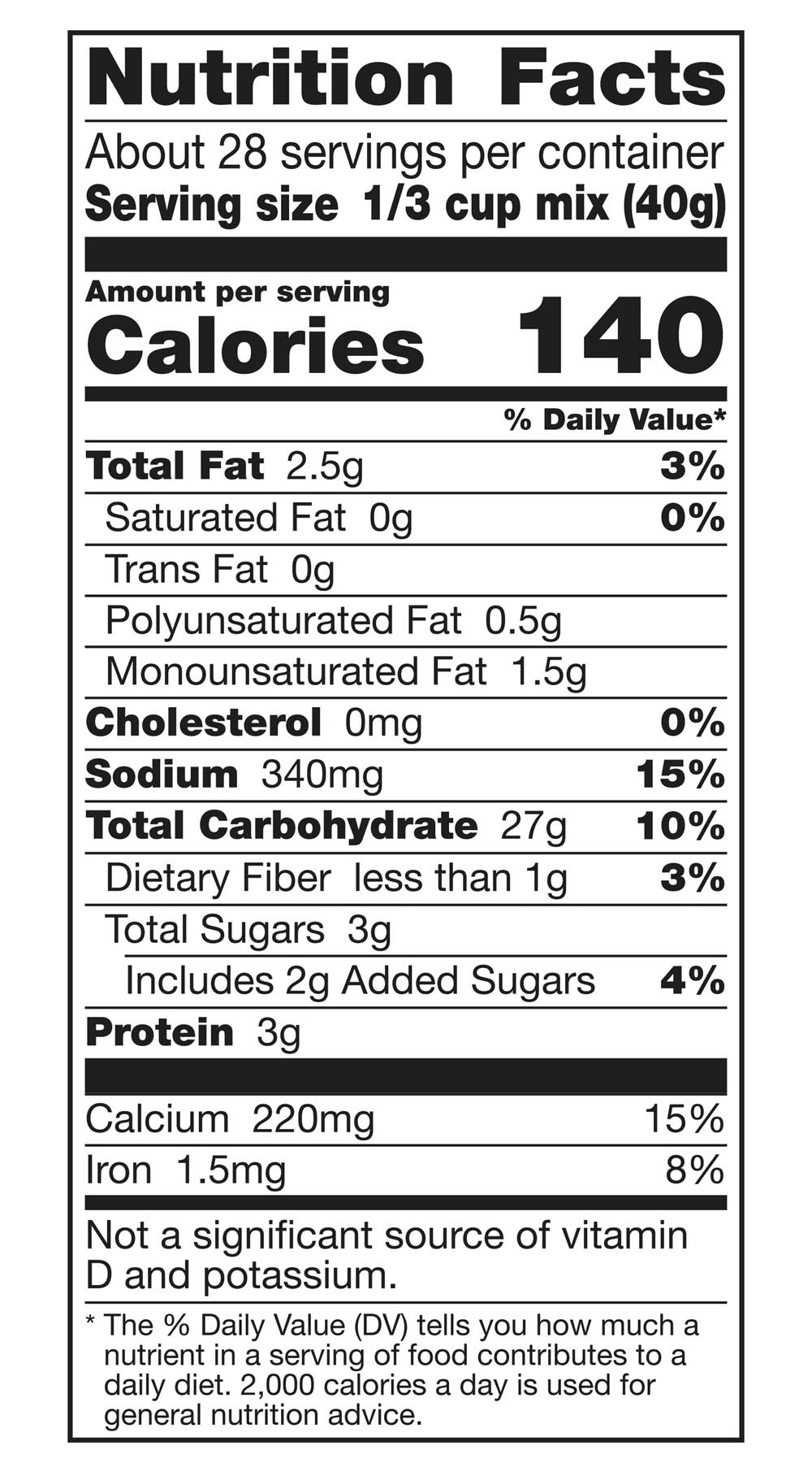 Mix, Pancake & Baking • Size: 40 OZ • Number of servings: 28 • General Mills Sales, Inc., Minneapolis, MN, 55440. • Packaging: Reusable