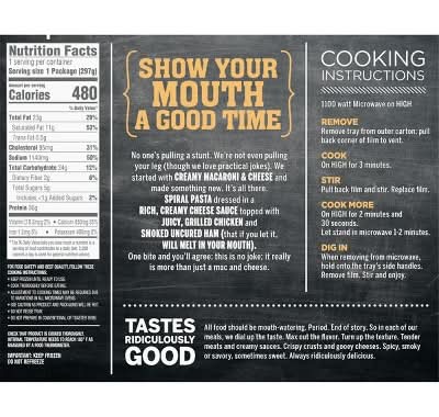 DEVOUR Chicken Cordon Bleu Mac & Cheese dials up the taste, max’s out the flavor and turns up the texture in this easy to make single serve frozen meal. This savory pasta includes everything you crave from the classic mac and cheese. It is packed with spiral pasta topped with juicy grilled chicken and perfectly smoked ham, in a thick and creamy cheese sauce made from Swiss and Provolone cheese. Ready to eat in minutes, it includes a cooking tray that ensures your dish is cooked to the fullest. • Flavor: Chicken cordon bleu • Size: 12.8 OZ • Devour Foods Llc, Chicago,IL,60601