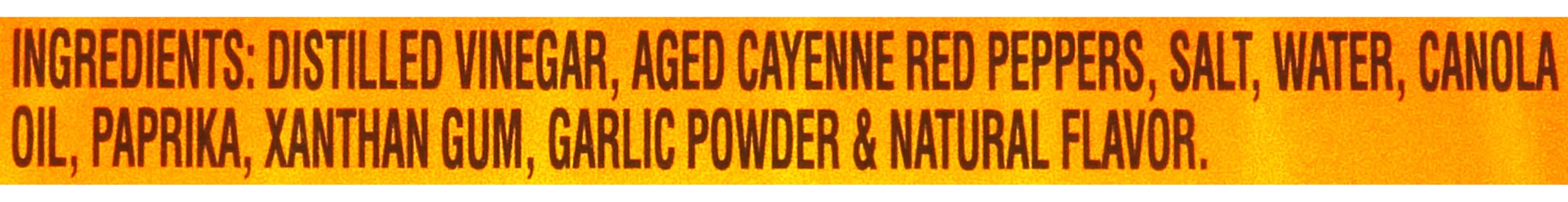 Ingredients: Distilled Vinegar, Aged Cayenne Red Peppers, Salt, Water, Canola Oil, Paprika, Xanthan Gum, Garlic Powder Natural Flavor.